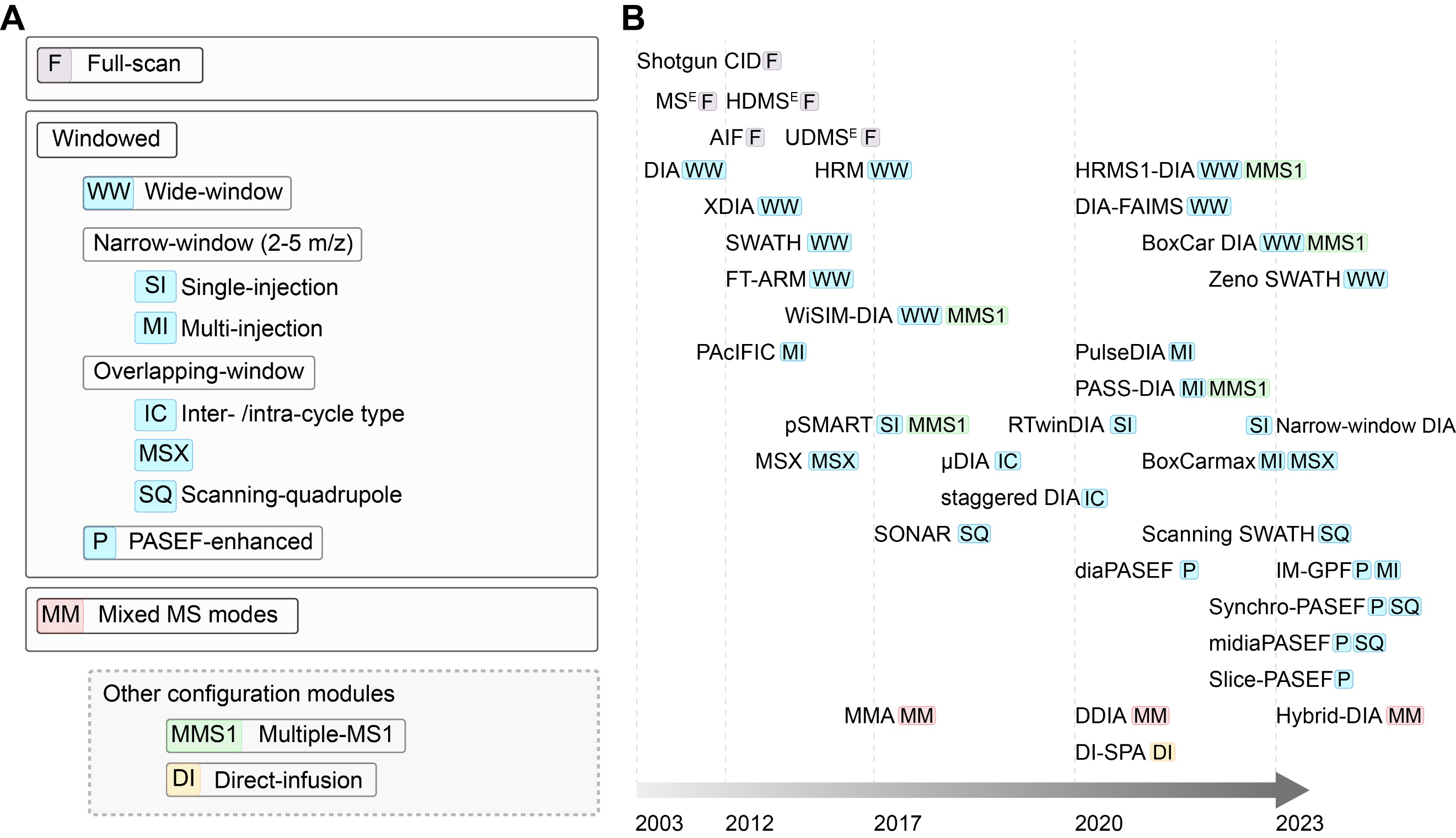 图1:近二十年DIA采集方法的分类(A)和发展时间线(B)