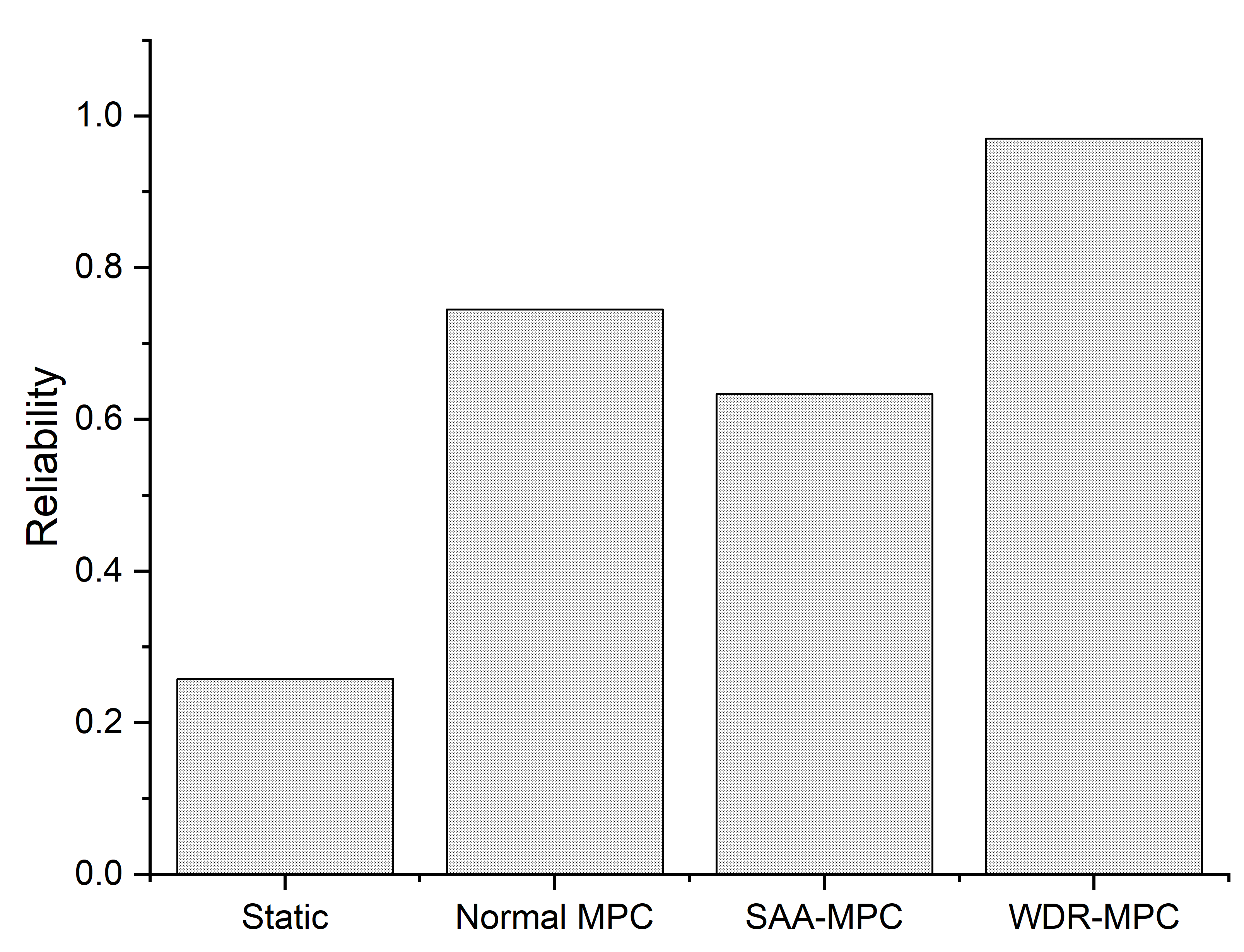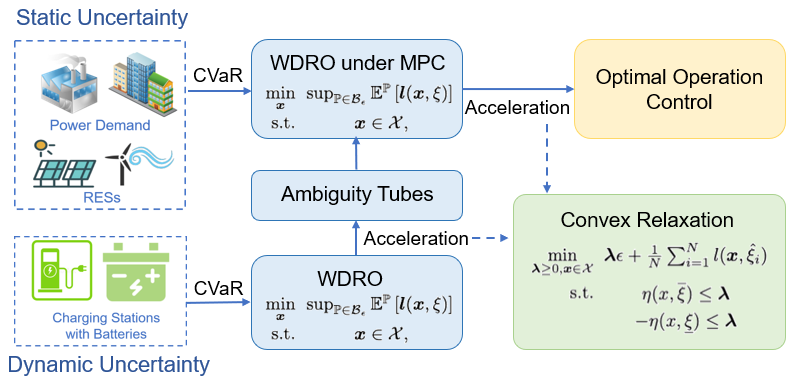 信息学院石野课题组提出一种基于Wasserstein度量的分布鲁棒模型预测控制方法,首次同时针对智能电网中的静态和动态两种不确定性建模。利用分布鲁棒优化方法计算出动态不确定性的集,并将其与模型预测控制相结合,同时利用凸松弛方法对该算法进行加速。该方法能够同时有效地处理智能电网中的静态不确定性与动态不确定性,并保证电网系统的稳定运行。
