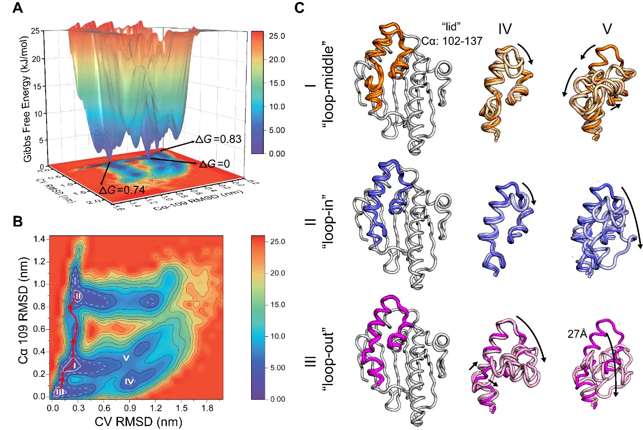 通过采用基于亲和力的虚拟筛选和基于结合动力学的筛选相结合的策略,发现31个与HSP90具有明显结合信号的苗头化合物,测定了其中16个结合较强的化合物与HSP90的结合动力学数据,实验数据与模型预测结果具有较高的一致性,进一步验证了模型的预测准确性与可靠性。进一步解析了N-HSP90α的单体(apo)结构以及与多个抑制剂分子的复合物结构,发现单体N-HSP90α存在不同构象。不同的配体可以进行构象选择或改变构象平衡,诱导构象重排,从而对结合动力学产生影响。随后通过粗粒度元动力学模拟揭示了单体N-HSP90α的不同构象之间的转变分子机制,如图2。N-HSP90α结构中“lid”(残基102-137)的灵活性是多种构象变化的基础,具有较长滞留时间和诱导螺旋构象能力的抑制剂对N-HSP90α的构象分布具有较为显著的影响。综上,本工作为开发更具成药性的N-HSP90α靶向抑制剂或针对其他靶标的新型药物分子设计提供了新的研究策略和范式。