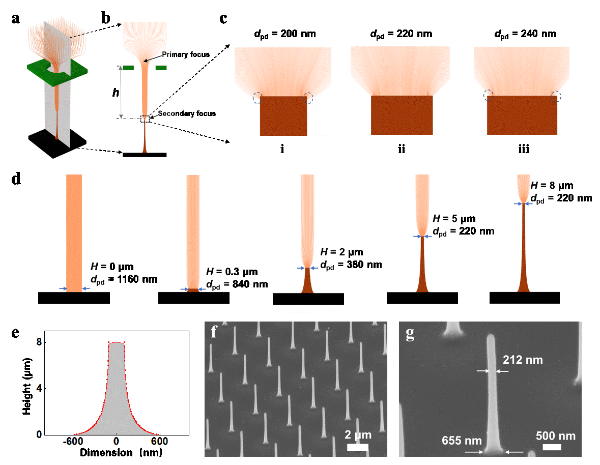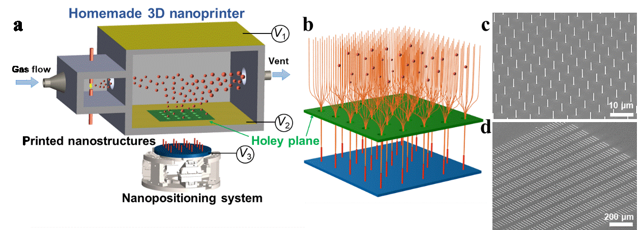 图4. 自主研制的“法拉第3D打印机”的示意图及其打印的纳米柱阵列和光栅结构