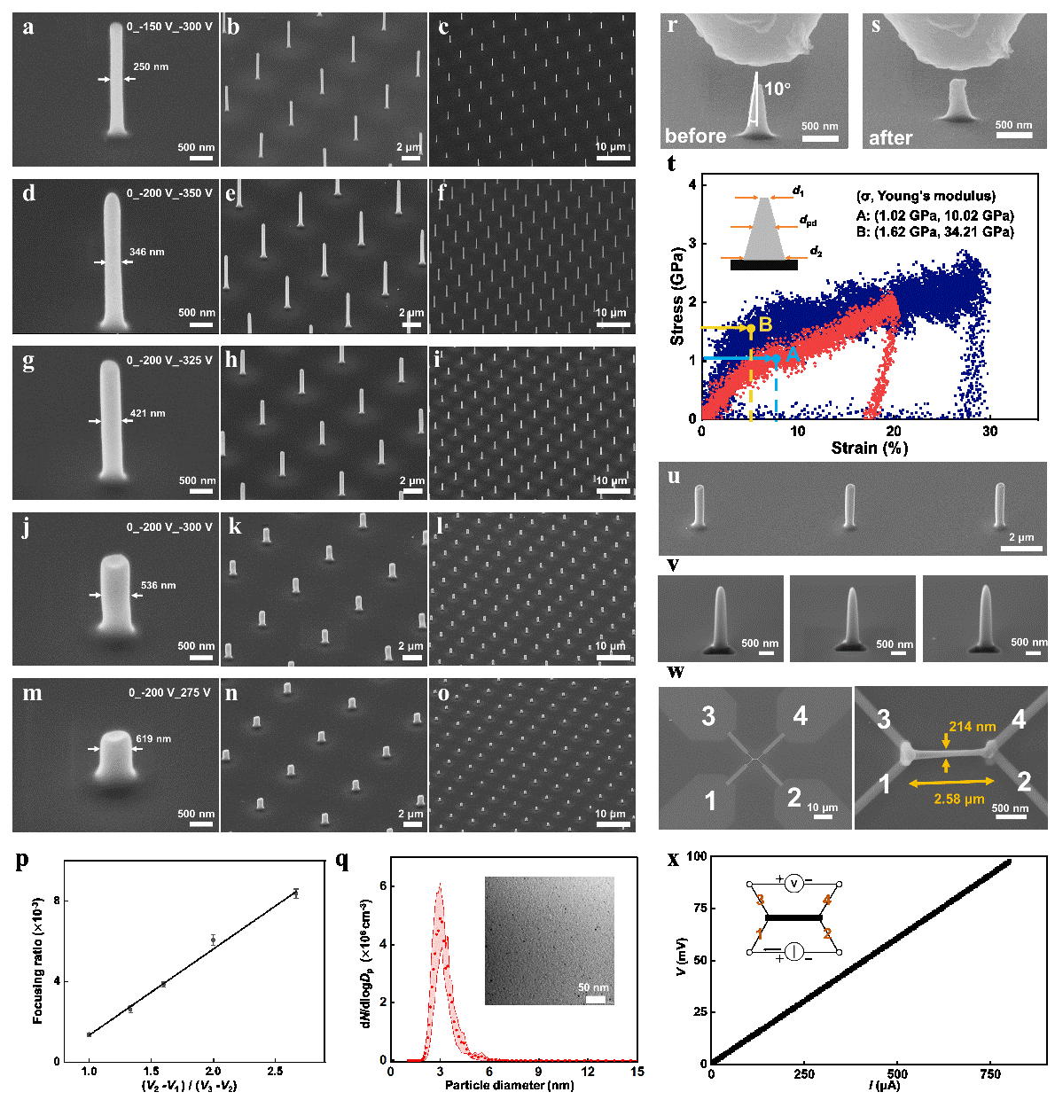 在上述理论指导下,该工作通过电势调控成功构建了尺寸线性变化的纳米柱。其力学性能处于文献报道中的前20%,导电性更是同类材料的3倍以上。通过使用聚焦离子束(FIB)进行切割并观察内部形貌,发现该结构内部均匀致密,这是其性能优异的重要原因之一。这一结果主要得益于打印所使用的超小纳米粒子(直径小于5 nm)极高的表面能,其类液滴特性使其在接触结构后直接发生融合。