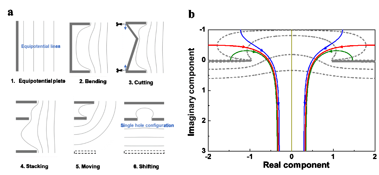 平坦大地外部的等势线是均匀分布,然而当人站在地面上时,周围的等势线会发生扭曲变形(图2)。基于这一原理,冯继成课题组运用共形映射得到了用于打印的三极板电场构造(图3)。首先,将垂直等势极板两端弯曲成“单边中括号”形状,接着将垂直部分弯折成“加和运算符”形状,然后剪断两端并叠加成一块中间极板。将上极板移到无限远处后,平移中间极板形成单孔结构。这一过程通过复变函数分析可精确描述单孔的等势线和电场线分布(见图3b)。为满足实际打印条件,冯继成课题组使用COMSOL模拟空间电场构型,并通过电力线守恒对“电力线画笔”实时原位调控,从而实现了对打印结构尺寸的精准控制。通过调整三极板的电势,还能进一步实现对“笔头状”电力线尺寸的调控。
