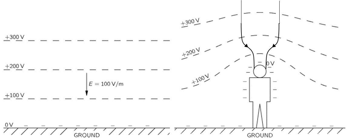 图2. 人体站在平整地面上,地面等势线扭曲产生聚束电力线