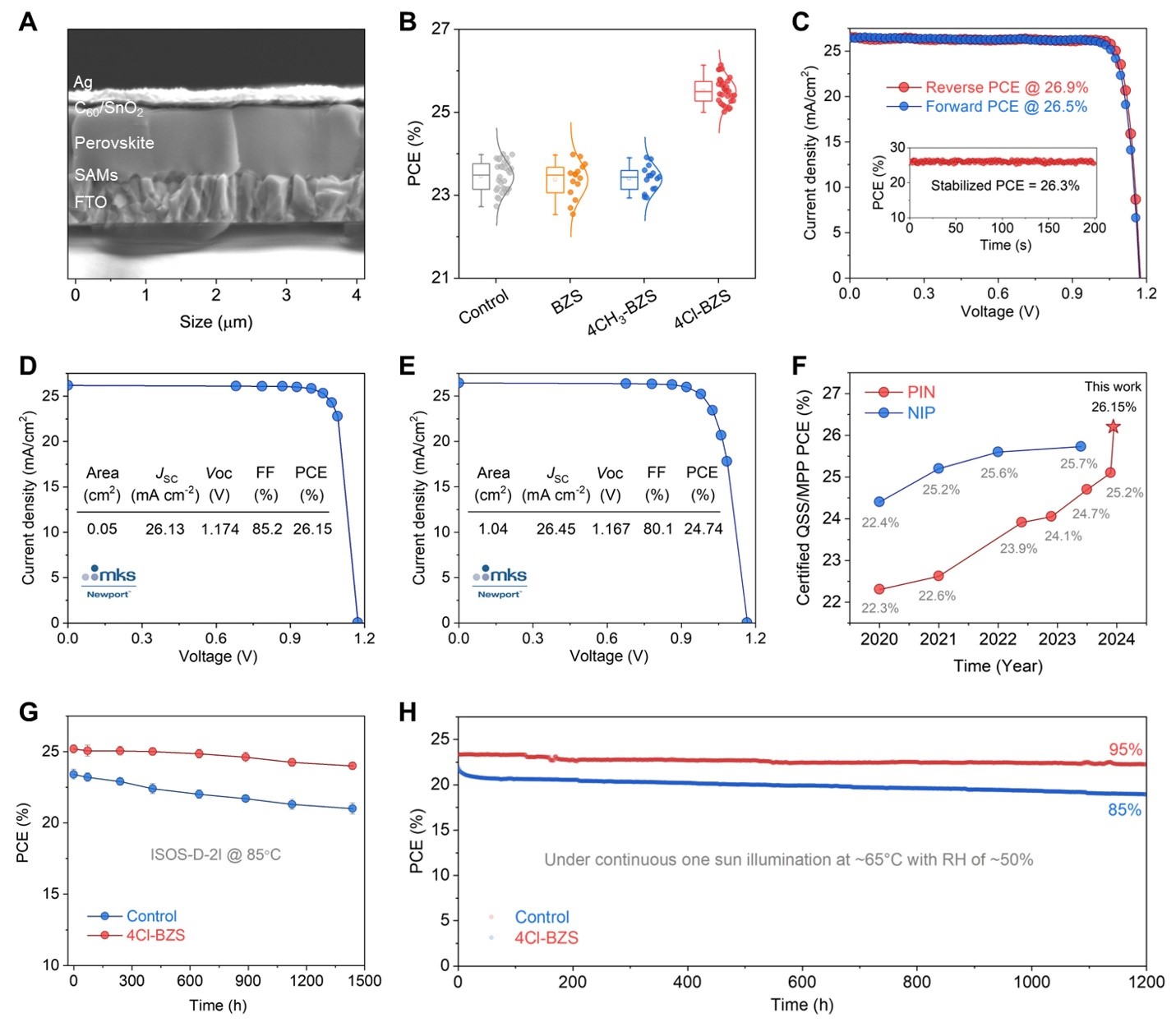 通过将4Cl-BZS分子引入到钙钛矿薄膜中,太阳能电池的光电转换效率得到了显著提升。器件在实验室的最高效率为26.9%。经权威机构Newport认证,0.05平方厘米和1平方厘米冠军器件分别取得了26.15%和24.74%的准稳态认证效率。该认证结果分别被美国可再生能源实验室(NREL)发布的Best Research-Cell Efficiency Chart 和全球光伏业界权威榜单Solar cell efficiency tables (Version 63) 收录,刷新了单结钙钛矿光伏器件权威认证效率纪录。此外,器件在光照高温(65℃)连续运行1000小时后效率维持在95%以上,表明器件具有极好的稳定性。