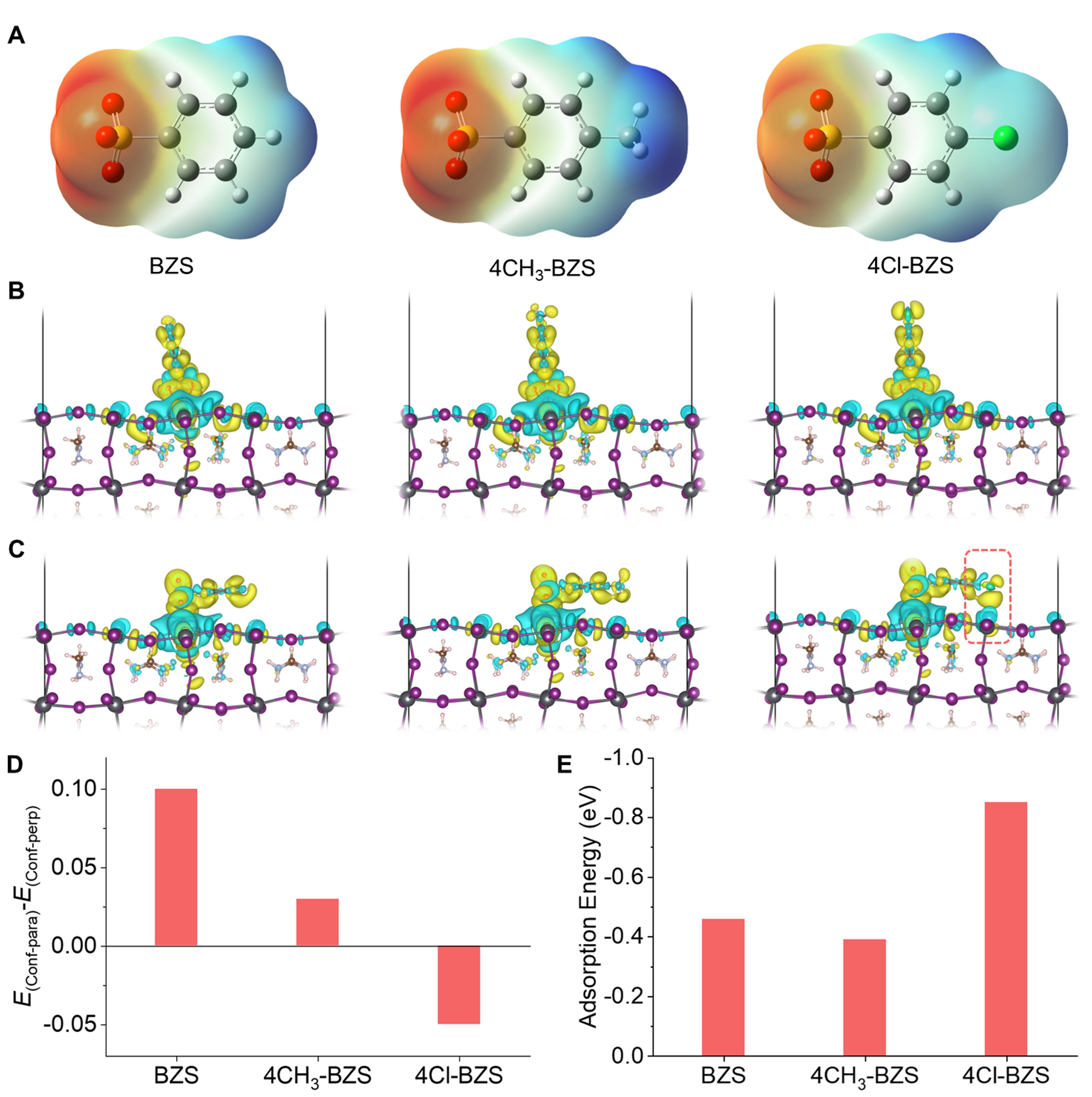 图1:钝化分子在钙钛矿表面的模拟结构与各种构型的结合能比较。