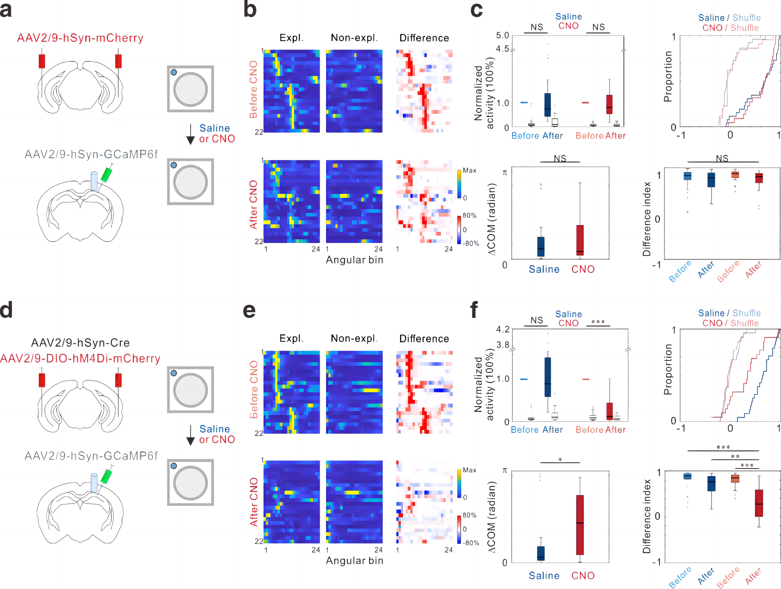 通过物体移动、新物体替换旧物体以及物体隐藏等一系列实验结果表明,oePC具有独特的位置场活动模式,与特定的空间信息而非表征物体本身的特征有关,而且这些神经元同时编码了对物体的探索意图。为了进一步研究oePC的特点,研究团队设计了跨天成像和环境变换等实验。结果表明,和经典位置细胞类似,oePC的神经元活动在相同环境中具有一定的稳定性和不同环境中具有重编程的能力。为了研究空间信息和行为信号如何在oePC中集成的神经通路,研究团队还进行了抑制外侧嗅皮层 (LEC)的实验,LEC是海马体接收非空间感官信息的重要输入脑区。结果显示,抑制LEC会干扰oePC的活动模式,这表明探索意图是通过LEC输入到海马CA1区域神经元的。(图2)