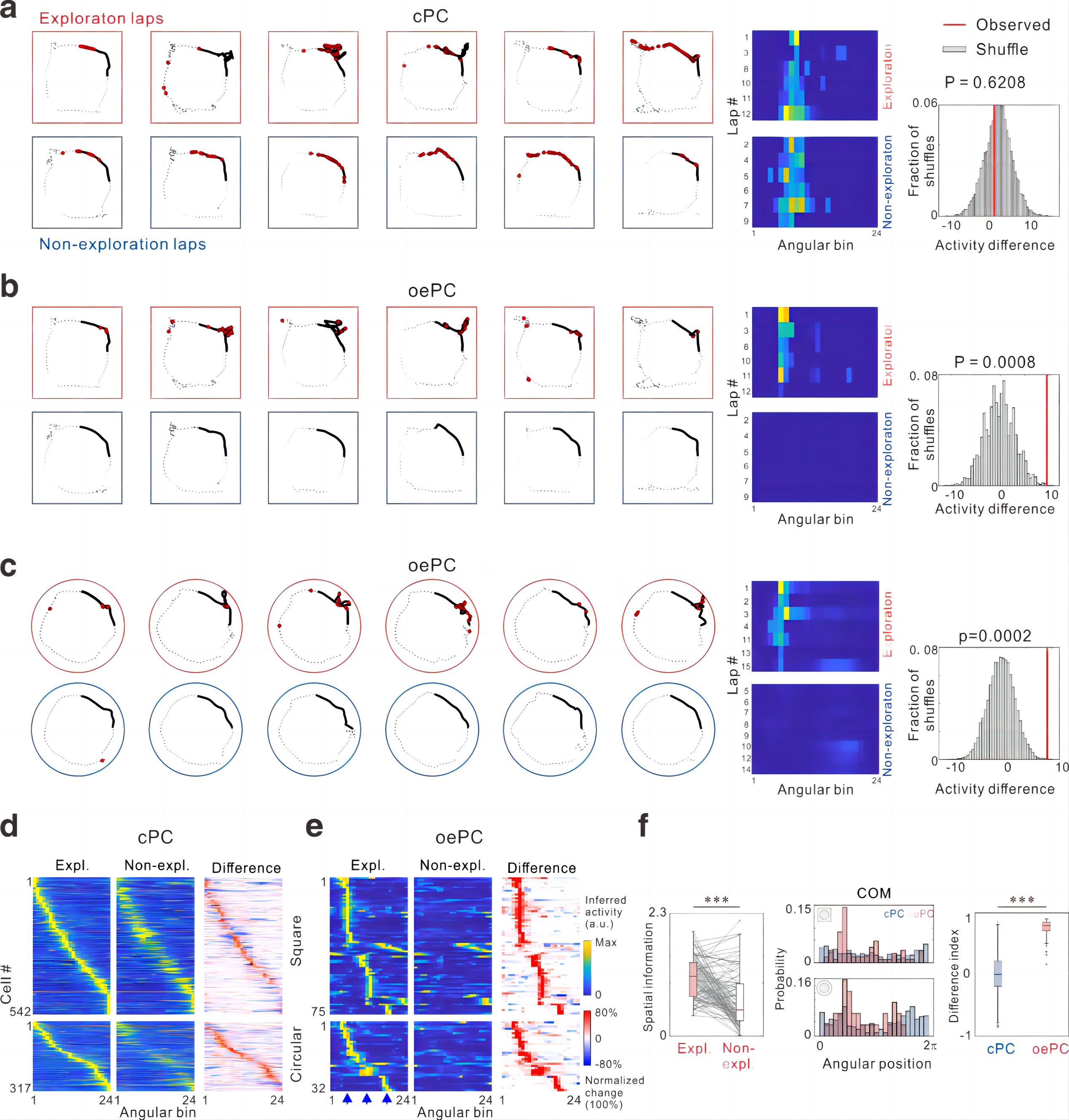 研究团队发现约50%的神经元被识别为位置细胞,在此基础上还发现了一群新的神经元,即物体探索依赖性位置细胞(oePC)。这些神经元只在动物探索特定位置时被激活,而动物只是沿着同样路径前进经过同样位置时则不会被激活。有趣的是,这些神经元在动物到达探索位置之前就开始活动,表明它们可能编码了动物的探索意图(图1)。