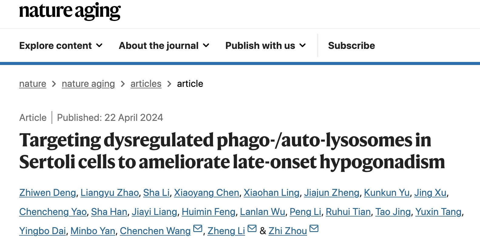 4月22日,九游体育(www.jiuyou.com)官方网站生命科学与技术学院周智课题组与上海市第一人民医院男科李铮主任团队、中国科学院上海高等研究院王晨琛团队在衰老领域期刊《自然·衰老》(Nature Aging)上发表了题为“Targeting dysregulated phago-/auto- lysosomes in Sertoli cells to ameliorate late-onset hypogonadism”的研究论文,发现睾丸新陈代谢协调和衰老有密切联系,并且通过激动溶酶体功能的小分子可以减轻LOH小鼠的症状。
