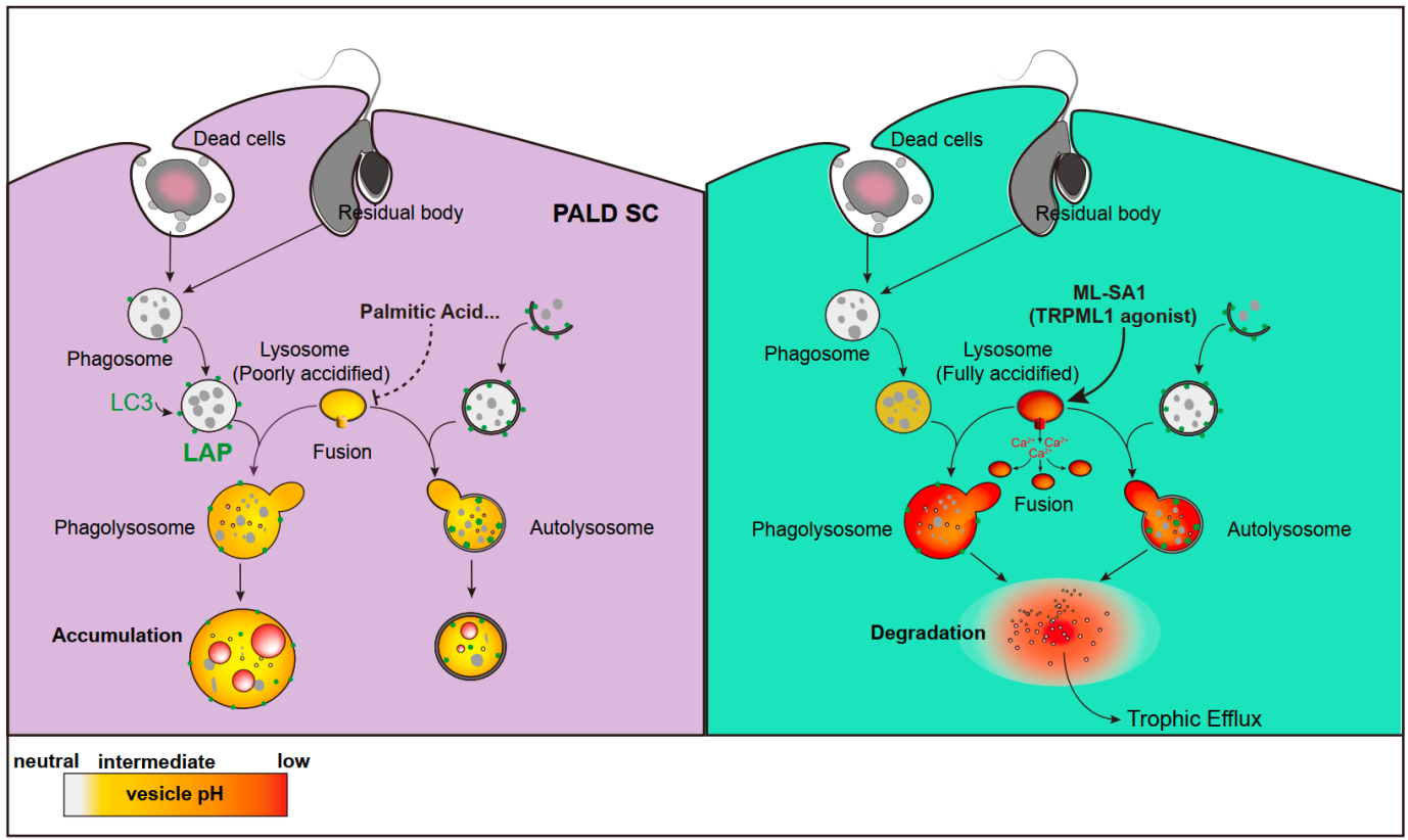 图2:示意图左侧显示Phago-/auto- lysosome dysregulated (PALD) SC中溶酶体酸度异常导致代谢物累积;右侧通过改善溶酶体功能恢复SC的代谢和营养支持功能。
