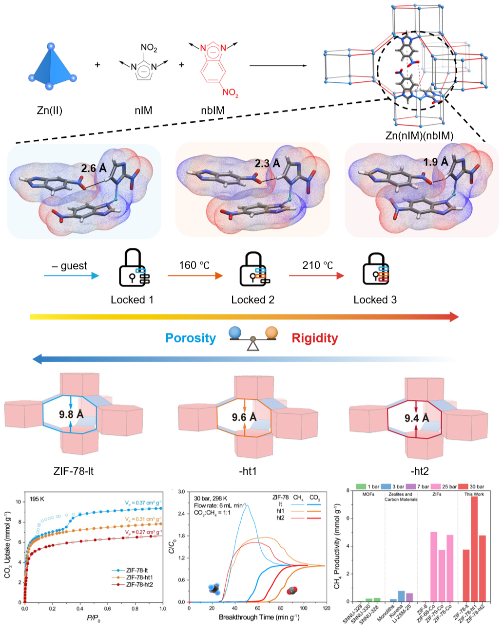 研究人员采用具有四面体Zn(II)金属中心和菱沸石(GME)柔性网络的ZIF-78,在不同活化温度条件下成功分离了三种结构锁定异构体;通过单晶结构分析和第一性原理计算发现逐级结构锁定的分子机制是由两个相近双六元环配体之间从π-π堆积作用过渡到C-H···O氢键作用,协同诱导晶体结构发生逐级收缩;通过框架从柔性到刚性转变的多级调控,在高压CO2/CH4气体动态吸附穿透突破实验中实现最佳的CO2吸附工作容量和CH4纯化产率。该成果为通过反转框架柔性提升多孔材料实际分离性能的研究提供了分子层次和能量定量的新科学内涵,有望为天然气纯化提供关键的碳捕集技术,助力天然气能源绿色转型和节能减排。