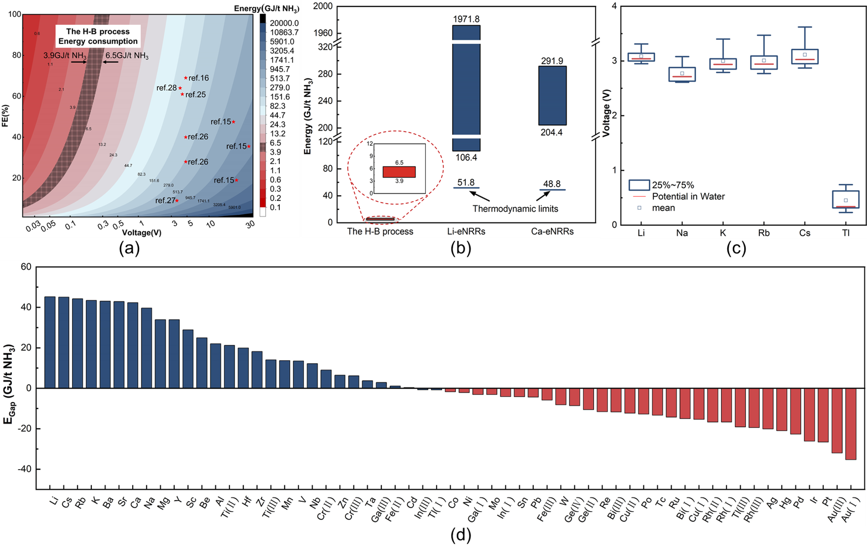 图2.(a) 法拉第效率和电池电压对能耗的影响 (b) H-B工艺、Li-eNRRs 和 Ca-eNRRs能耗范围 (c) 水和有机溶剂中电池电压的差异 (d) M-eNRRs工艺与 H-B 工艺之间的能耗差。