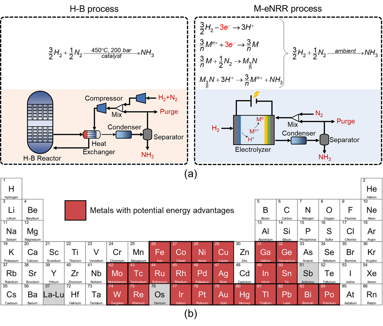 图1. (a) 合成氨工艺(H-B工艺和M-eNRRs工艺)。 (b) 纯热力学角度 M-eNRRs工艺中可能具有比H-B工艺能耗更低的介导金属。
