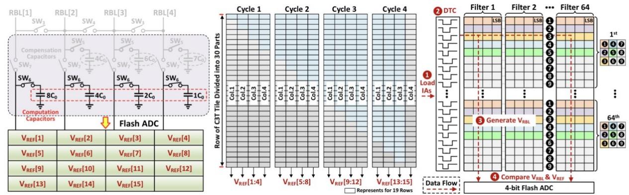 本研究通过优化C3T动态存储单元结构,成功实现了支持高保持时间的多模式操作;设计了一种自适应可重构的灵敏放大器(ARSA),充分利用C3T结构特性实现参考电压存储,显著提升了计算能效。在此基础上,团队通过重构ARSA实现4-bit Flash ADC,并结合多周期的参考电压自适应生成技术,实现了快速且低功耗的低温卷积计算。在这个过程中,信息科学与技术学院寇煦丰课题组所提出的低温器件模型对本工作电路设计与优化起到重要作用。