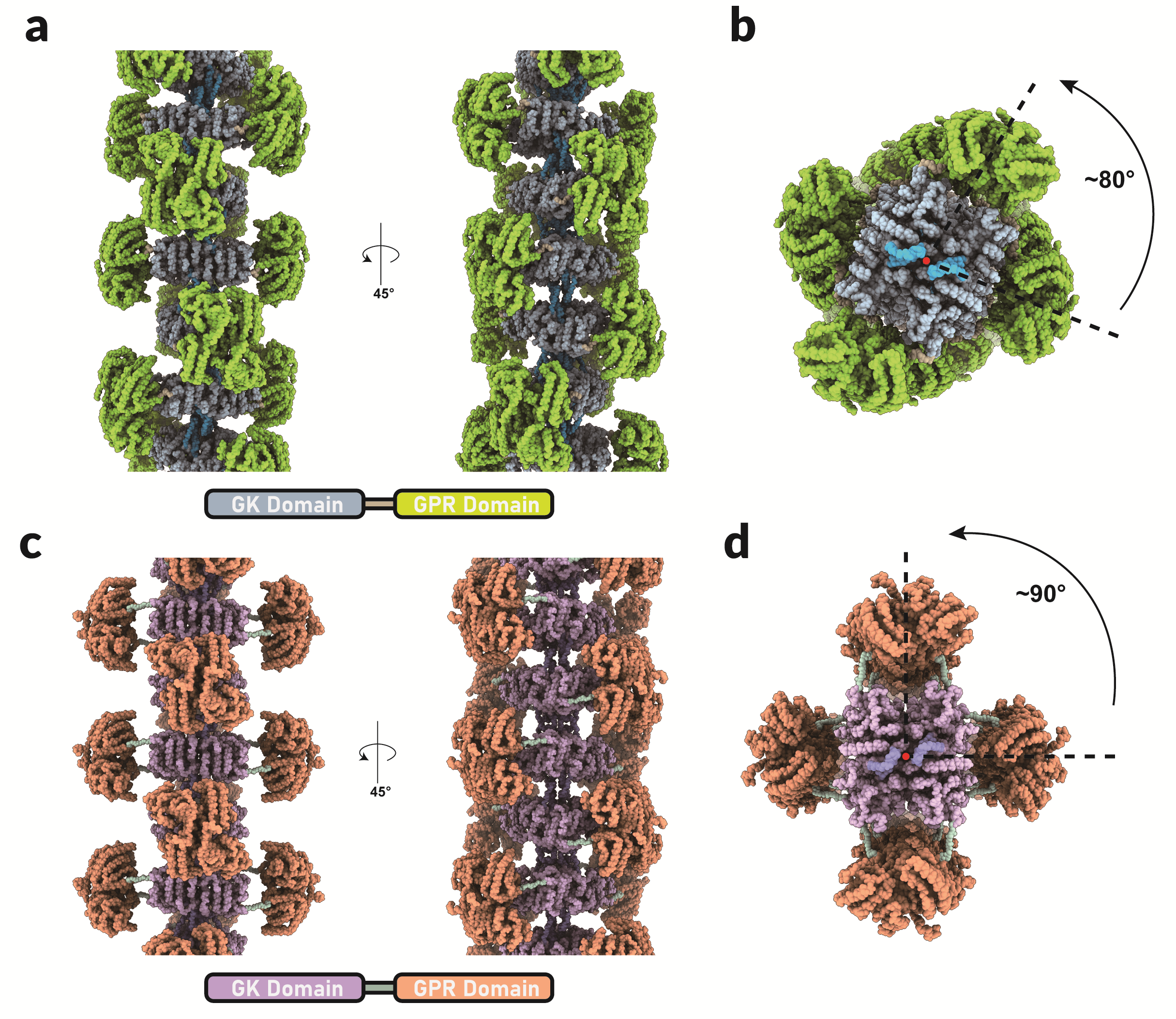 另一方面,AtP5CS的丝状化对于提高脆弱中间产物G5P的传递效率至关重要,这有助于整个催化过程。在AtP5CS丝状结构中,GK和GPR两个功能域之间显示出很大的灵活性,GPR二聚体能够在GK四聚体周围进行显著的旋转。这种结构特点使得GK和GPR活性中心之间的距离在某些情况下显著缩短,从而有助于中间产物的有效传递。此外,GPR活性位点与相邻螺旋单元的GK活性位点之间的距离几乎相同,这也为中间产物的转移提供了可能。AtP5CS丝状结构为GPR二聚体的旋转和中间产物的传递提供了一个特殊的平台。