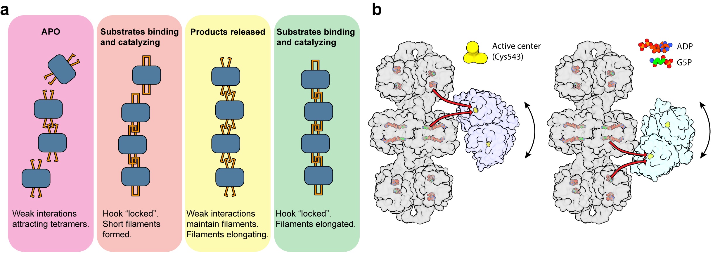 (a) AtP5CS代谢纤维组装模型; (b) 代谢纤维促进底物通道作用的机制。