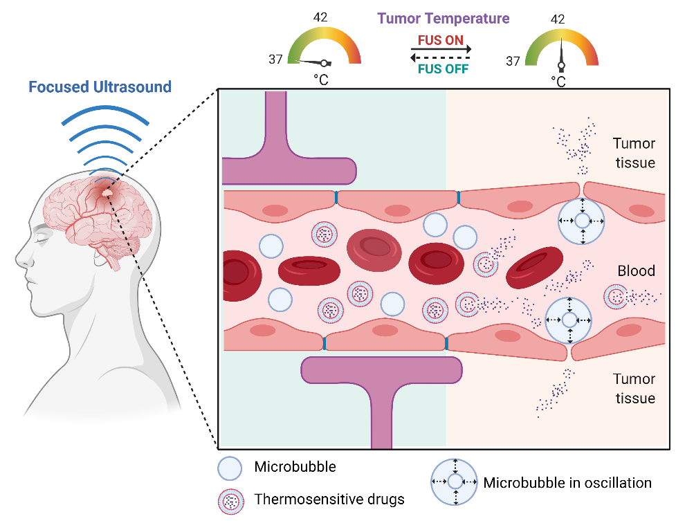 脑肿瘤是全球重大健康问题,具有致死率高、难以治愈的特点。药物治疗是脑肿瘤重要治疗手段之一,然而,血脑屏障严重阻碍了药物入脑,大大限制了其治疗效果。此前,课题组研发了一种针对脑肿瘤的新型药物递送技术——微泡增强的磁共振引导经颅聚焦超声温热疗法。该技术可同时实现脑部靶向温热疗法和血脑屏障开放,增强脑部药物靶向递送的安全性和有效性,具有临床转化前景。然而,该新型药物递送技术中微泡增强聚焦超声加热效率的物理机制尚不明确。