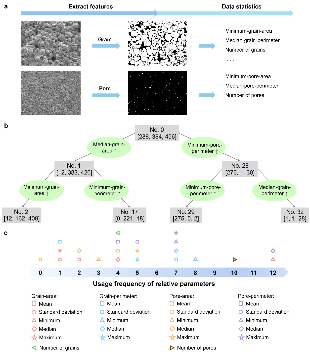 研究人员通过改变制备条件得到不同离子电导率的样品及相应的显微形貌图,将离子电导率划分为高、中、低三个等级,并利用决策树模型将显微结构与离子电导率关联,分类预测准确率超过90%。他们还从显微结构中提取物理参数(颗粒、孔隙),定量分析了参数对离子电导率的影响。研究表明该模型对其它氧化物锂离子导体(锂镧钛氧)也具有高的分类准确率。