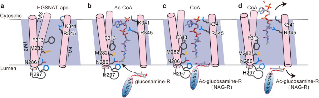 本工作解析了以二聚化的形式存在的HGSNAT,其整体形状类似于大写字母“M”,是一种全新的折叠结构(图1)。HGSNAT的跨膜螺旋形成亲水性的跨膜通道。位于胞质侧的Ac-CoA进入跨膜通道并引起通道扩张。通道中的活化位点组氨酸和天冬酰胺催化乙酰基从Ac-CoA转移到位于溶酶体侧的HS的葡萄糖胺基,完成乙酰基从细胞质一侧转移到溶酶体侧。反应后,游离CoA被释放到细胞质中,乙酰化HS扩散到溶酶体腔内,进一步被降解(图2)。