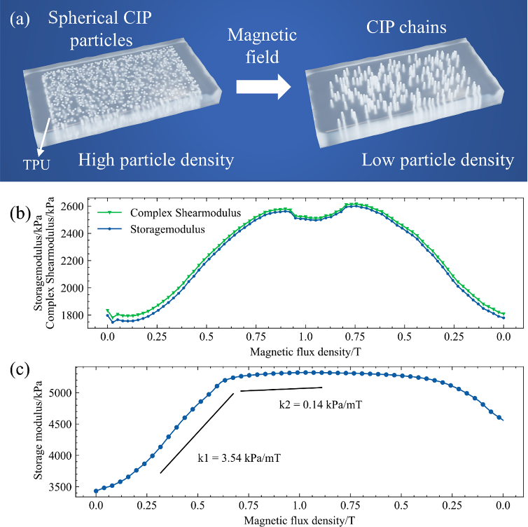 图4.(a)磁场强度与CIP颗粒填充形式、填充密度关系的解释;(b, c)在低剪切振幅下观察到的剪切模量-磁场曲线顶部坍塌现象