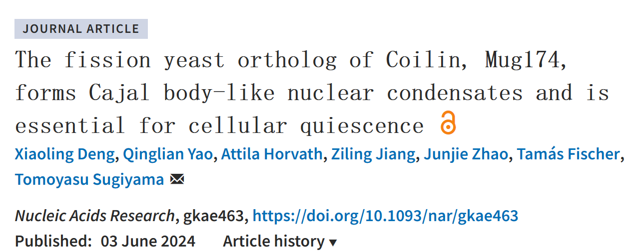 Tomoyasu Sugiyama研究团队长期以裂殖酵母为模式生物研究核体。该工作通过对比Mug174和Coilin蛋白,发现二者在序列和结构上具有相似性。进一步研究发现Mug174能与Cajal body的组分U RNAs和TMG合酶Tgs1相互作用。据此研究团队得出Mug174是裂殖酵母中Coilin的同源物的结论。