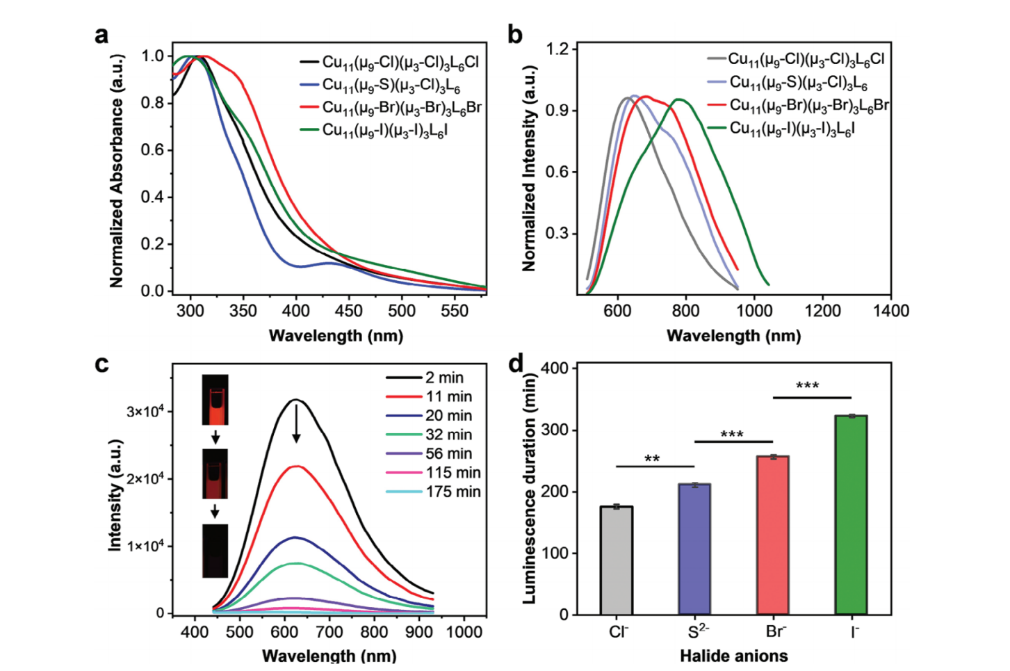 通过改变CuNCs中心原子或桥接卤素离子,团队还制备了一系列非平衡CuNCs,Cu11(μ9-E)(μ3-X)3L6X (E=S2- or X; X=Cl-, Br-, I-),实现了原子水平上对耗散组装体光学性质和荧光持续时间的精准调控(图3)。与大多数基于有机小分子的耗散组装体不同,耗散型金属纳米簇易于集成在聚合物网络中,从而实现水凝胶从硬凝胶到软凝胶最终到溶胶的自主转变(图1b),CuNCs稳定性和凝胶状态切换周期可通过调控燃料浓度、O2压力和pH等环境因素实现。