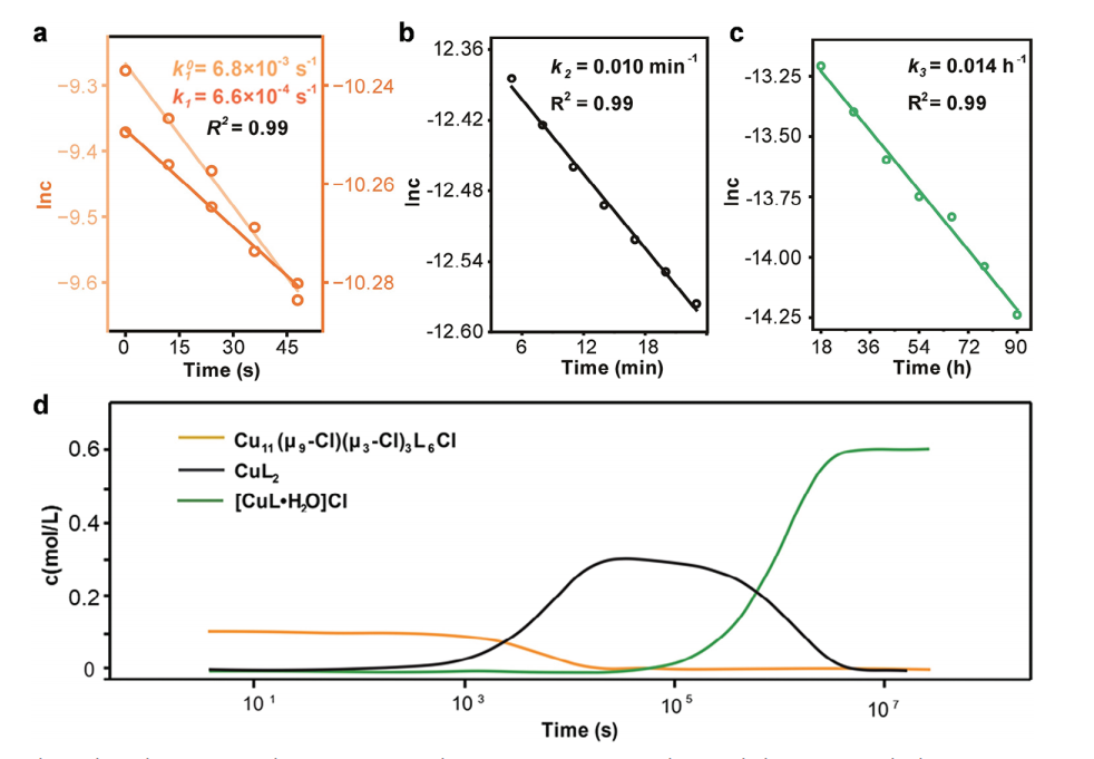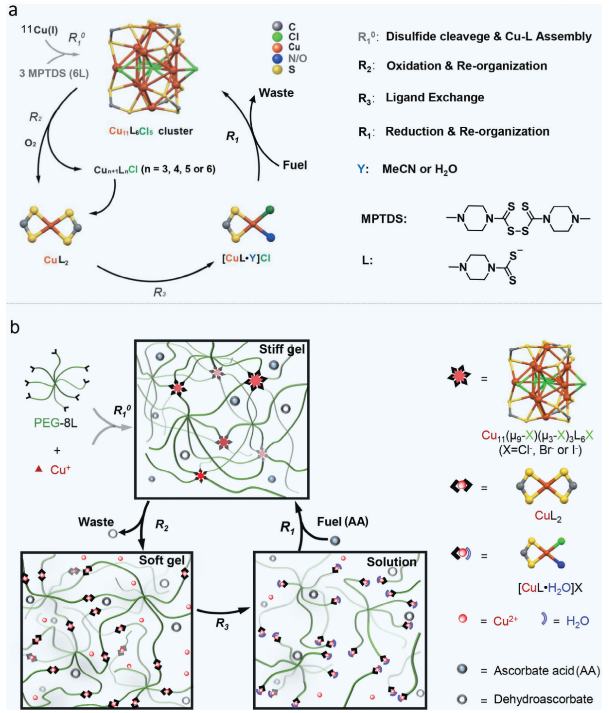 团队发现,当按一定比例混合二硫羧酸盐配体(L)、Cu(I)和Cl-时,可选择性得到Cu11(μ9-Cl)(μ3-Cl)3L6Cl纳米簇。随后,Cu(I)氧化引起Cu(I)-配体比例变化,使该CuNCs重构为新的非平衡组装体(Cun+1LnCl, n=3、4、5和6)和亚稳的CuL2。最后通过配体交换,转化为平衡的[CuL·Y]Cl络合物(Y=MeCN或H2O)。由于系列级联反应中合适的反应动力学(k1>k2>k3,图2),该体系可自主完成以上转变。再次添加燃料(抗坏血酸)后,系统可重新回到非平衡态,组成一个基于金属-配体配位的耗散循环。