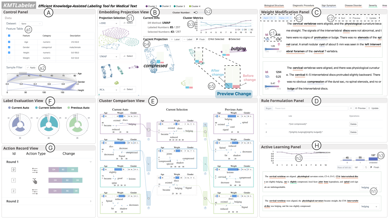 课题组将上述工作流程整合到了一个名为KMTLabeler的交互式可视分析工具中,该工具配备了协调的多级视图和交互,支持领域专家有效探索、仔细探查和精确识别不同的数据标签。通过基于三个真实世界数据集的两项案例研究及一项对照用户研究,充分证明了 KMTLabeler 在提供医疗文本高效标注环境方面的有效性与可靠性。