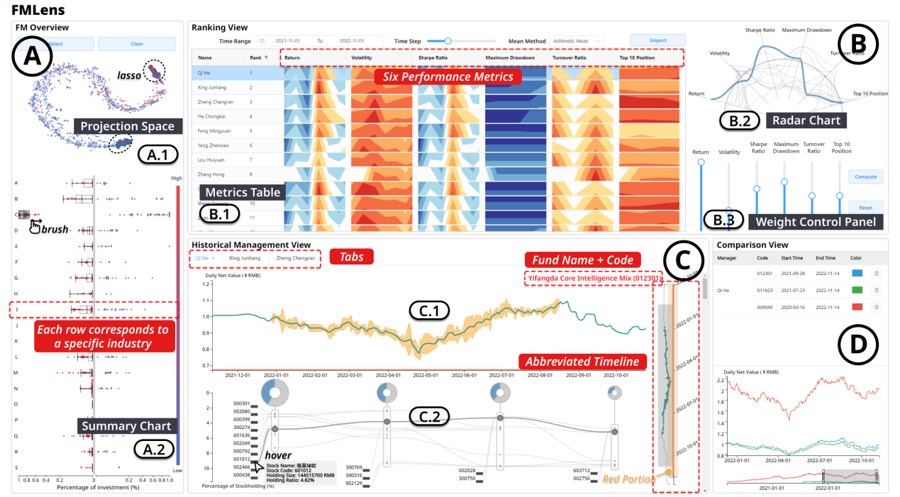 基金业绩在很大程度上依赖于管理者(基金经理)的专业能力。与普通投资者相比,基金经理可凭借其投资知识和专业技能获得更大的竞争优势,越来越多的投资者在投资时会考虑基金经理的能力。目前已有研究采用定量或定性的方法从业绩指标、个人特征和业绩持续性等多个层面来分析基金经理。但如何从一个庞大的候选空间中比较和选择基金经理仍然面临挑战。此外由于金融市场的不确定性,如何区分其业绩是源于技能还是运气同样也是一个挑战。为此,李权课题组分析了投资者在选择合适的基金经理时的需求,并提出了一个交互式可视分析系统FMLens来简化基金经理的选择过程。系统支持投资者从多个维度对基金经理的投资风格和能力进行有效地评估和解构,还支持对基金经理的历史业绩的系统性回顾、检查和比较。此外,系统还利用基于行业指数的回归方法来模拟基金仓位的每日变化,进而帮助刻画基金经理的持仓风格。通过两项案例研究和定性用户调研,证明了综合方法的有效性。