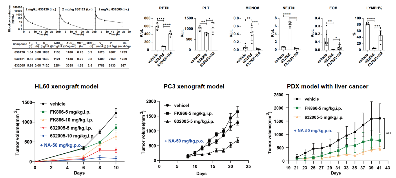 对已开发的PROTAC分子进行进一步优化得到了代谢稳定性更好的第二代PROTAC分子(632005),证明其在与烟酸联用时,可在体内外有效的减弱靶向NAMPT的毒副作用。为进一步评估联用烟酸给药对PROTAC抗肿瘤作用的影响,研究还构建了血液恶性肿瘤、前列腺癌的异种移植模型以及来源于病人的肝癌PDX模型,证明了靶向NAMPT的PROTAC联用烟酸在NAPRT缺陷的泛癌中具有显著的抗肿瘤效果。