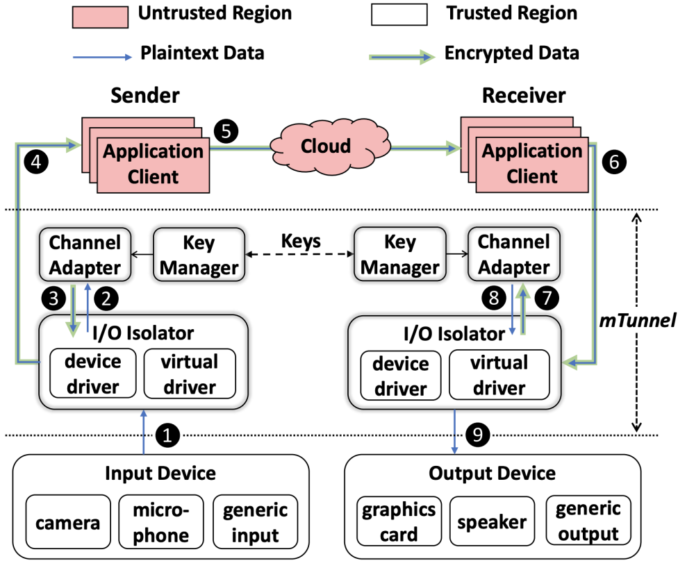 杨智策教授课题组的研究成果以题为“Enforcing End-to-end Security for Remote Conference Applications”被2024年IEEE安全与隐私大会(IEEE Security & Privacy, S&P 2024)录用。在这篇论文中,杨智策指导学生挖掘远程会议系统可能存在的安全隐患,并提出了一款全新的名为mTunnel的工具。mTunnel安装在系统的软件层,用户无感知,但可对敏感数据加密,如会议过程中的文字、音频和视频等,使得敏感数据在被不可靠的用户接触前就已形成有效防护。图1展示了mTunnel的基础架构。mTunnel代码已开源,可供相关研究者继续探索端到端远程会议系统的安全性问题。