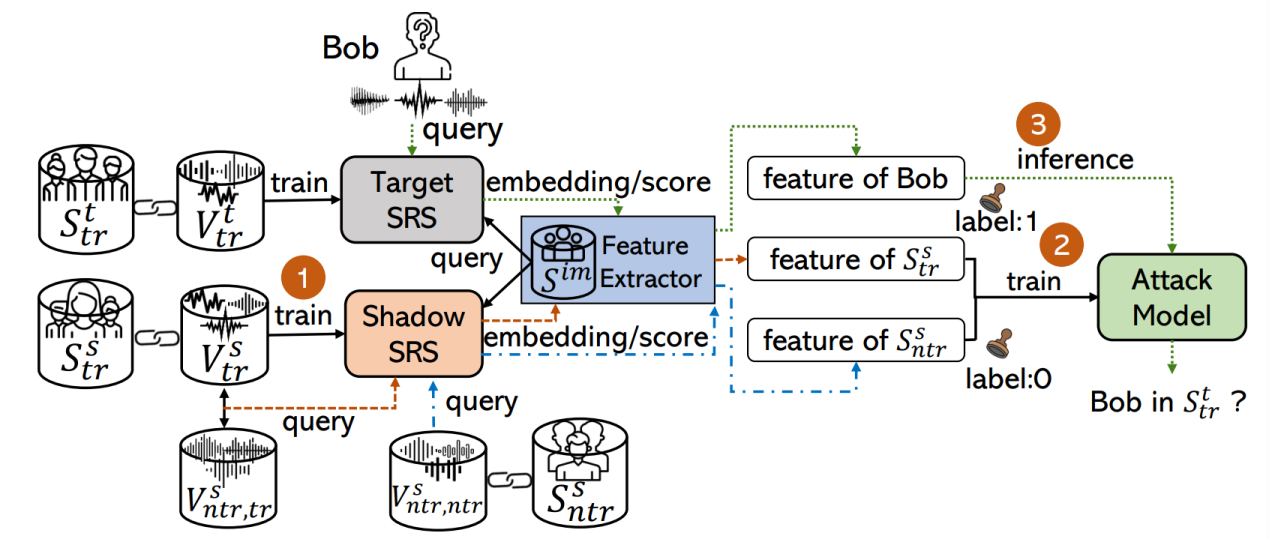 王春东教授课题组博士研究生陈光科在声纹识别方向取得重要进展。声纹识别系统依赖大规模训练说话人的语音进行训练。由于训练时的过拟合,系统会记忆训练数据的信息。因此,训练后攻击者可通过与系统的黑盒交互,推断出训练数据的额外信息,造成隐私泄露。陈光科等提出了一种说话人级别的成员推断攻击SLMIA-SR,可判定是否存在目标说话人的任一条语音被用于训练,即目标说话人是否为训练说话人。除了可对声纹识别系统的隐私水平进行测评外,该攻击还可供用户审计或取证语音生物数据是否未经授权被使用。相关论文题为“SLMIA-SR: Speaker-Level Membership Inference Attacks against Speaker Recognition Systems”,被2024年网络与分布式系统安全大会(Network and Distributed System Security Symposium,NDSS 2024)录用,图3是SLMIA-SR的工作流程。