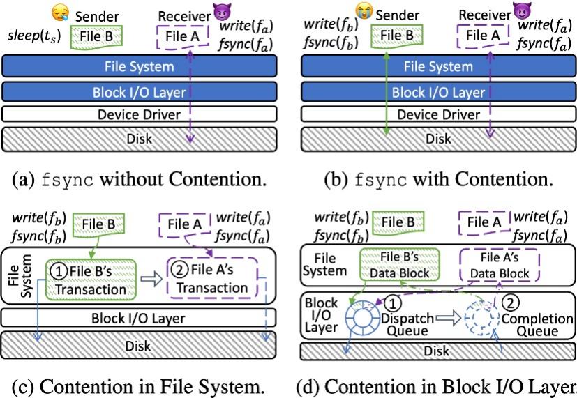 王春东教授指导一名硕士研究生独立发现了一个全新隐蔽侧信道(命名为Sync+Sync),该隐蔽侧信道基于计算机存储常用fsync函数调用。受共享软件和硬件资源的影响,fsync会在计算机上发生资源竞争,导致每个程序都将经历更长的反应时间。王春东团队基于该观察搭建Sync+Sync信道,Sync+Sync在确保信息安全性的同时实现高效性,可在常用固态硬盘上以大约0.40%的低错误率提供每秒20000数据位的传输带宽。此外,利用Sync+Sync还可区别分析出多个常用应用程序和网站,具有较高精度。该成果题为“Sync+Sync: A Covert Channel Built on fsync with Storage”,被2024年USENIX安全大会(USENIX Security 2024)接收。Sync+Sync隐蔽信道研究的代码已开源。图4描绘了Sync+Sync的信道基础。