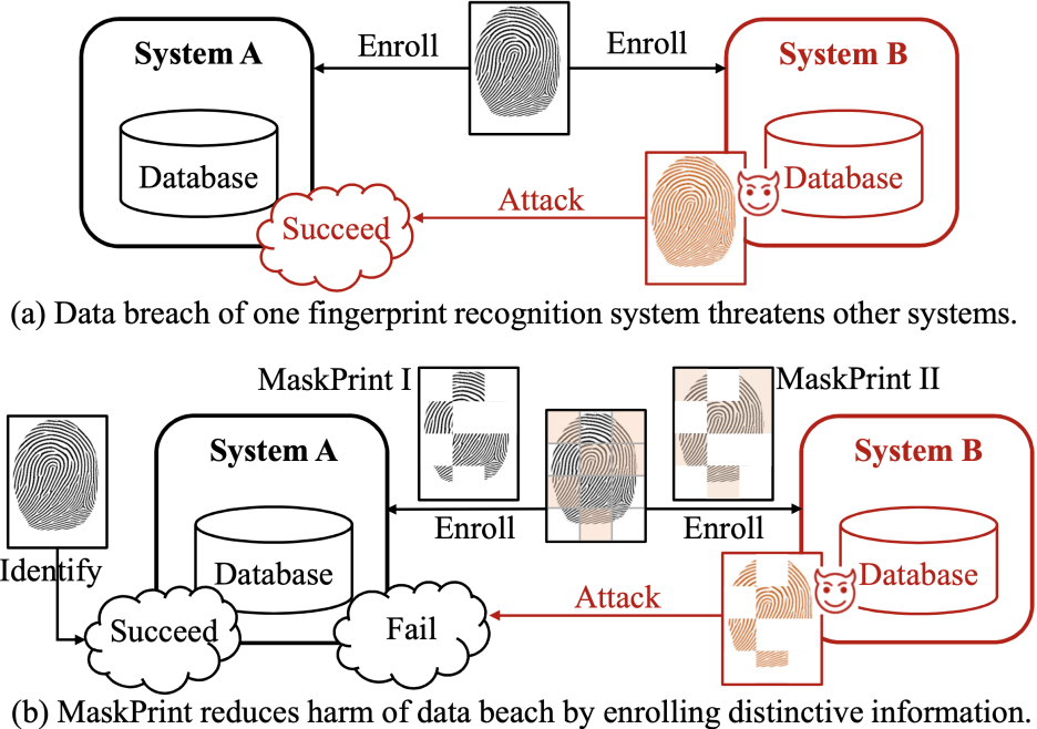 杨智策教授课题组的另一项成果以题为“MaskPrint: Take the Initiative in Fingerprint Protection to Mitigate the Harm of Data Breach”被2024年ACM计算机与通信安全大会(ACM Conference on Computer and Communications Security, CCS 2024)录用。作为重要的生物信息,对指纹的保护机制是安全领域长久以来的重要问题。该论文提出了一种用户透明、与设备无关的保护措施,即MaskPrint,能够在指纹识别设备发生数据泄露的情况下也能避免用户的指纹信息被恶意获取。图2展示了MaskPrint的工作原理,基本思想是使用精心挑选的指纹片段而非完整指纹在不同的指纹识别设备中进行注册,这样,它们都能与原始指纹匹配,但单独设备的数据泄露不会导致完整指纹信息的泄露,保证了其余指纹识别系统的安全性。