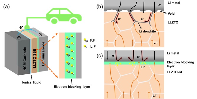 锂离子电池极大便利了人们的生活,但目前基于石墨负极的锂离子电池存在安全性能差、能量密度低等缺陷,无法满足日益增长的使用需求。锂金属可提供比石墨负极高十倍的理论比容量,但存在枝晶易生长导致的电池短路问题。因此,采用固体电解质取代易燃的有机液体电解质来增强电池安全性的方案得到了研究人员的广泛关注。石榴石型Li7La3Zr2O12(LLZO)具有高的离子电导率、宽的电化学窗口和良好的锂金属稳定性,被认为是最具应用潜力的固体电解质之一。然而,传统的电解质界面改性层并不能完全阻挡电子从集流体传输到固态电解质内部,这会导致锂枝晶的形核析出和生长渗透。陶瓷基石榴石电解质与正极之间固-固接触界面带来的高阻抗也是另一个严重问题。