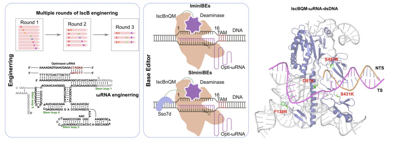 CRISPR-Cas9系统由于其便于操作及靶向性等特点被开发成一系列基因编辑工具,比如核酸酶编辑(nuclease editing)、碱基编辑(base editing)和先导编辑(prime editing)。其中,碱基编辑可在不引起双链DNA断裂的情况下在目标位点有效实现单个碱基的替换,在单碱基突变疾病治疗中展现了广阔的应用前景。由于SpCas9的体积较大,基于SpCas9介导的碱基编辑器无法通过单个腺相关病毒(AAV)递送。AAV是在体基因治疗的主要递送手段,但其包装极限是4.7 kb,因此缩小碱基编辑器的大小对在体进行疾病基因治疗的应用至关重要。为了解决这一问题,学界开始寻求用小Cas蛋白代替Cas9进行精确的基因编辑。来自IS200/IS605转座子超家族中的一类RNA引导核酸酶OgeuIscB被报道具有与Cas9相似的结构域,且大小只有SpCas9的1/3。但天然的OgeuIscB在哺乳动物细胞内的编辑活性不到2%,还需进一步优化提高其编辑效率。