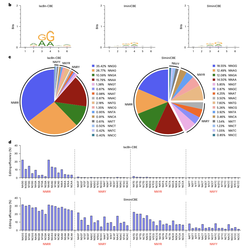 本研究基于IscB-ωRNA-DNA复合体的结构,分别对IscB蛋白和ωRNA进行了工程化改造,得到了活性最高的突变体IscBnQM和opti ωRNA,并将基于IscBnQM和opti ωRNA的碱基编辑器命名为IminiBEs。其中,IminiCBE(平均编辑效率为67%)和IminiABE(平均编辑效率为52%)分别实现了高效的C到T或A到G的碱基编辑效率。对于一些编辑效率仍然较低的靶向位点,研究者将非特异性DNA结合蛋白Sso7d与IminiBEs融合后,进一步将低效位点的编辑效率提高约2 ~ 3倍,并命名为SIminiBEs。此外,通过TAM(靶邻近基序)识别实验发现,相较于野生型IscB nickase的典型NWRRNA (N代表任何碱基,W代表碱基A/T, R代表碱基A/G)TAM识别位点,IminiCBE和SIminiCBE失去了“W”和“A”的限制,可识别NNRR, NNRY(Y代表碱基C/T)和NNYR TAM序列,从而拓宽了IminiCBE和SIminiCBE在基因组中的可靶向范围。总体而言,IminiBEs和SIminiBEs是可编辑特定基因组位点的高效微型基编辑器,扩展了用于基因组编辑的微型CRISPR工具箱。