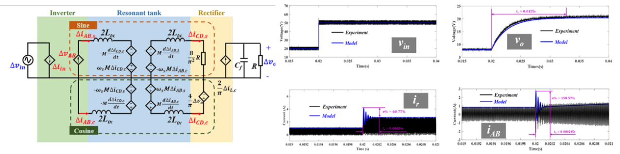 大信号模型可以用于分析和预测系统在面临大扰动时的响应,但现有的大信号模型存在着复杂、非线性、缺乏物理意义等不足,难以真正应用。傅旻帆课题组深入研究了IPT系统中逆变器、谐振腔和整流器模型,通过逆变器和谐振腔固有的线性特征以及分段线性化方法,分别推导出了逆变器、谐振腔和整流器的线性大信号模型。在此基础上,提出了IPT系统的线性大信号模型,并开展了时域实验验证。
