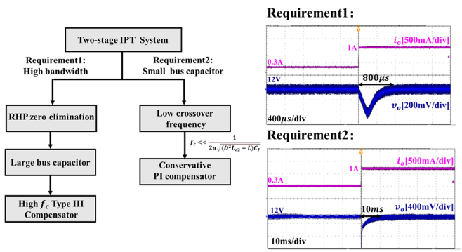 为提高感应式IPT系统的设计与控制自由度,可在IPT系统的后端加入电力电子变换器,形成两级IPT系统。然而,这种两级系统在某些情况下可能会出现动态性能较差甚至不稳定的现象。为了解决这个问题,傅旻帆课题组从系统的小信号模型出发,利用IPT系统阻抗模型分析了两级系统之间的耦合。通过建立整个系统的小信号模型和传递函数,研究人员系统地讨论了母线电容的影响,以及母线电容与系统控制带宽之间的平衡关系。最终提出了具有不同响应速度的控制器设计策略,并进行了闭环实验验证。