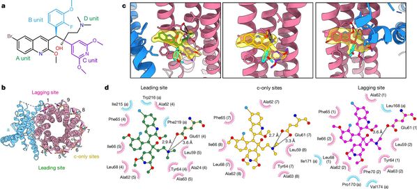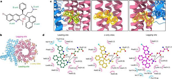 研究利用“基因敲入-基因敲除-基因过表达”策略,结合亲和层析及凝胶过滤层析蛋白纯化方法,最终借助耻垢分枝杆菌获得了均一稳定有活性的结核分枝杆菌ATP合成酶蛋白样品。而后借助单颗粒冷冻电镜技术,成功解析了BDQ结合状态下的结核分枝杆菌ATP合成酶的高分辨率冷冻电镜结构(如图1所示)。本研究发现,BDQ主要通过喹啉基团(A基团)和二甲氨基基团(D基团)与结核分枝杆菌ATP合成酶强烈地相互作用并结合到跨膜区域的多个位点,阻止了ATP合成酶跨膜区域c环的旋转,进而阻断了质子的运输,最终阻止了ATP的合成,达到“饿死”结核分枝杆菌的目的。