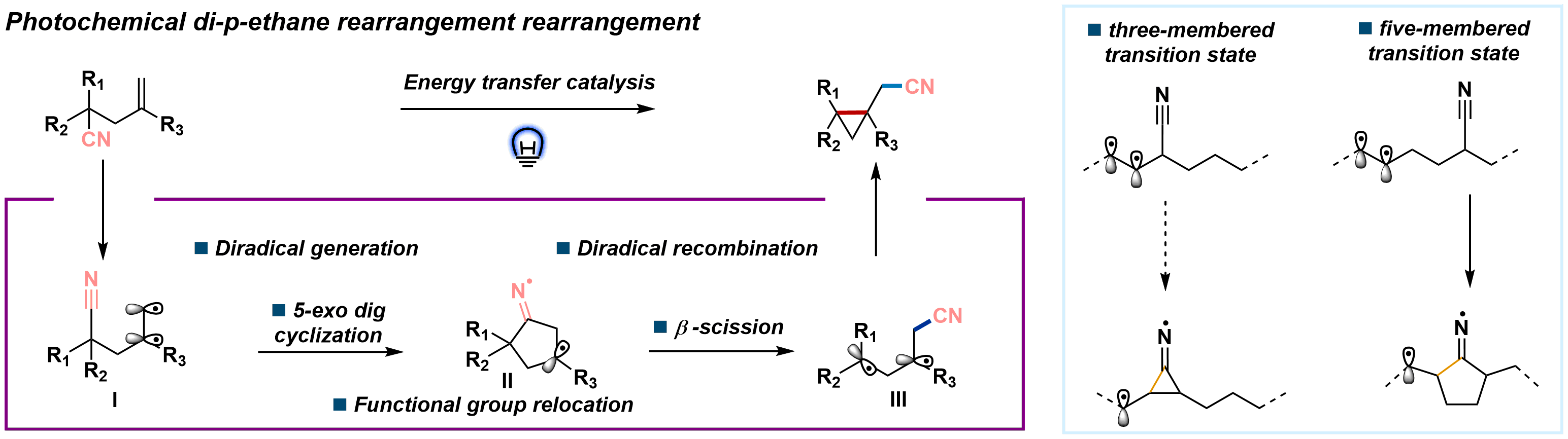 自由基反应是复杂药物分子与高性能材料合成的核心策略之一,其中重排反应可带来分子内官能团的精确迁移,实现分子构象的精妙调控,改变目标分子的性质。不断探索新型、高效且具备良好选择性的自由基重排反应体系,从而构建满足特定需求的功能性分子,是化学家们亟需攻克的关键课题。双π-甲烷重排反应(Zimmerman重排反应)是一类经典的自由基重排反应,是天然产物化学与药物合成领域的关键工具。然而由于过渡态能垒过高等原因,极易转化的氰基官能团难以参与到这一反应中。