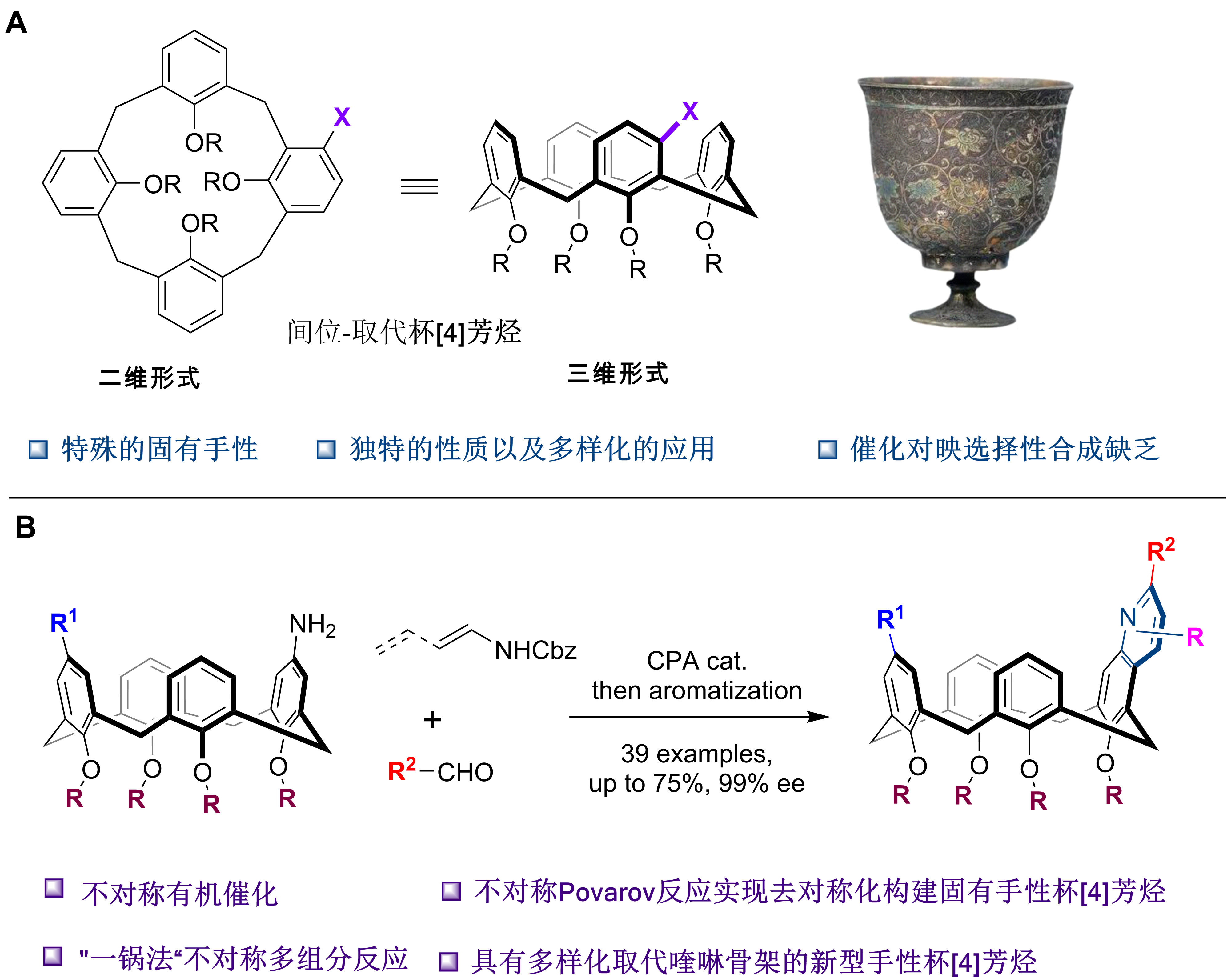 大环芳烃在物质分离、检测技术及催化反应等领域均具备应用前景。作为大环芳烃家族中的重要成员,杯芳烃因其独特的三维刚性结构,形似杯子而得名(图1,A),这种非平面的三维构型赋予了杯芳烃独特的性质。当杯[4]芳烃的一个苯环间位上具有一个取代基时,该类分子就具备一类独特的分子手性——固有手性。鉴于这类固有手性骨架所蕴含的独特性能及其潜在的应用价值,其不对称合成吸引了众多研究者的研究兴趣。然而,通过高效且直接的催化不对称合成方法来构建这类分子结构仍面临一定的挑战,相关研究进展目前相对缓慢。