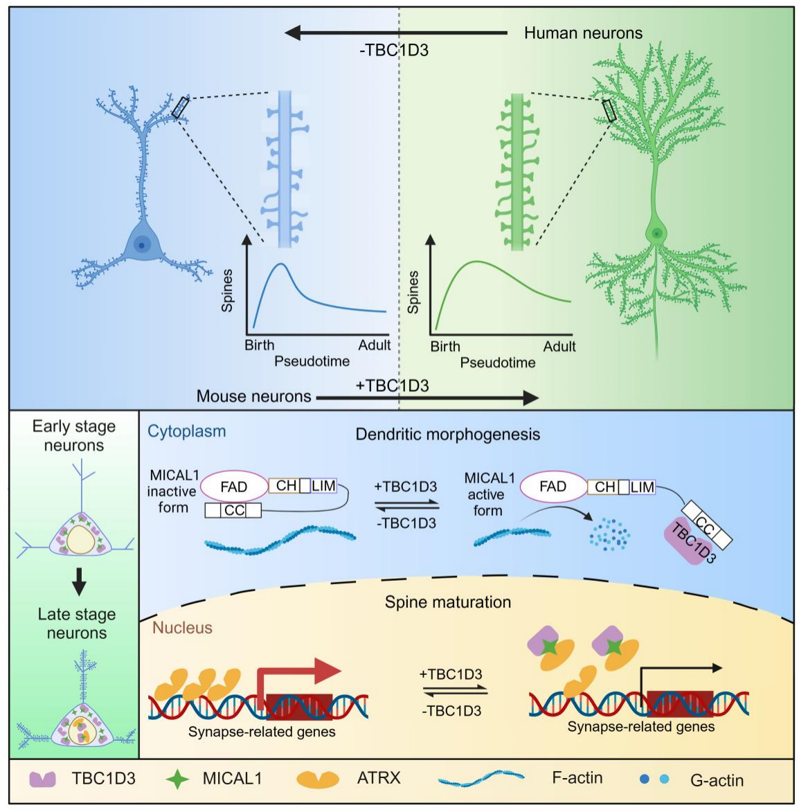 在机制方面,TBC1D3与肌动蛋白单氧化酶MICAL1相互作用,并激活MICAL1的肌动蛋白(F-actin)剪切活性,TBC1D3-MICAL1复合物分为两个不同的信号通路调节神经元发育。在人类神经元发育的早期阶段,TBC1D3-MICAL1主要定位在细胞质中,通过解聚F-actin来促进树突的复杂化。在神经元发育后期突触形成阶段,TBC1D3-MICAL1定位到细胞核中,结合染色质重构蛋白ATRX,弱化后者与基因组的相互作用,减慢突触形成相关蛋白的表达,延长突触成熟进程。由此,该研究揭示了人类进化过程中神经元发育与成熟的分子细胞机制,对于理解相关神经系统疾病机理、干预神经元衰老进程也提供了新启示。