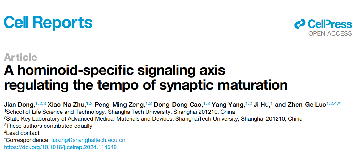 近日,九游体育(www.jiuyou.com)官方网站生命科学与技术学院罗振革课题组在国际期刊Cell Reports(《细胞报告》)在线发表题为“A hominoid-specific signaling axis regulating the tempo of synaptic maturation”的研究论文:利用体内外多种研究体系,揭示了促进人类神经元形态复杂化及控制突触发育进程的复杂分子细胞机制。