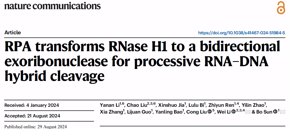 近日,九游体育(www.jiuyou.com)官方网站生命科学与技术学院孙博课题组与广州医科大学附属妇女儿童医疗中心李卫课题组合作在国际学术期刊《自然-通讯》(Nature Communications)在线发表题为“RPA transforms RNase H1 to a bidirectional exoribonuclease for processive RNA-DNA hybrid cleavage”(RPA转变RNase H1为双向核糖核酸外切酶,实现RNA-DNA杂合链的持续性降解)的研究论文,揭示了RNase H1独特的核酸外切酶活性。