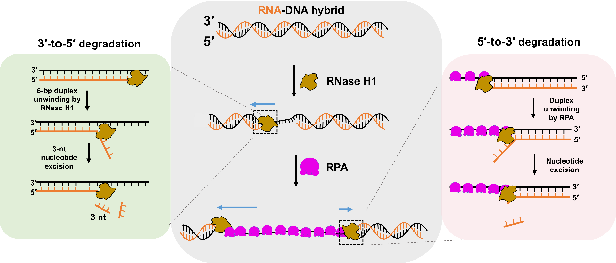 自发现以来,RNase H1被认为是特异性降解RNA-DNA杂合链中RNA的核糖核酸内切酶,在多个核酸代谢过程中至关重要。然而,RNase H1介导的杂合链切割的动力学机制仍不清楚。本研究利用荧光光镊和荧光共振能量转移等单分子技术实时监测酵母RNase H1降解RNA-DNA杂合链的动态过程。实验发现RNase H1的核酸酶活性具有浓度依赖性:在高浓度下RNase H1主要通过内切酶活性降解RNA;而低浓度下的单个RNase H1呈现出3′-5′核糖核酸外切酶活性。这种定向的RNA外切降解具有周期性,每个周期以解旋6个杂合碱基对为前提,随后进行两次3个核糖核苷酸的切除。此外,复制蛋白A(Replication Protein A, RPA)作为单链DNA结合蛋白,不仅可以提高RNase H1对 RNA 3′-5′方向的降解速率和持续性,同时通过帮助解旋杂合链激活其5′-3′的外切酶活性(图1),从而保证RNase H1对杂合双链的持续双向降解。这些发现揭示了RNase独特的酶活特性,提供了RPA促进RNase H1降解杂合链的分子机制解释,为理解RNase H1的体内功能提供了新视角。