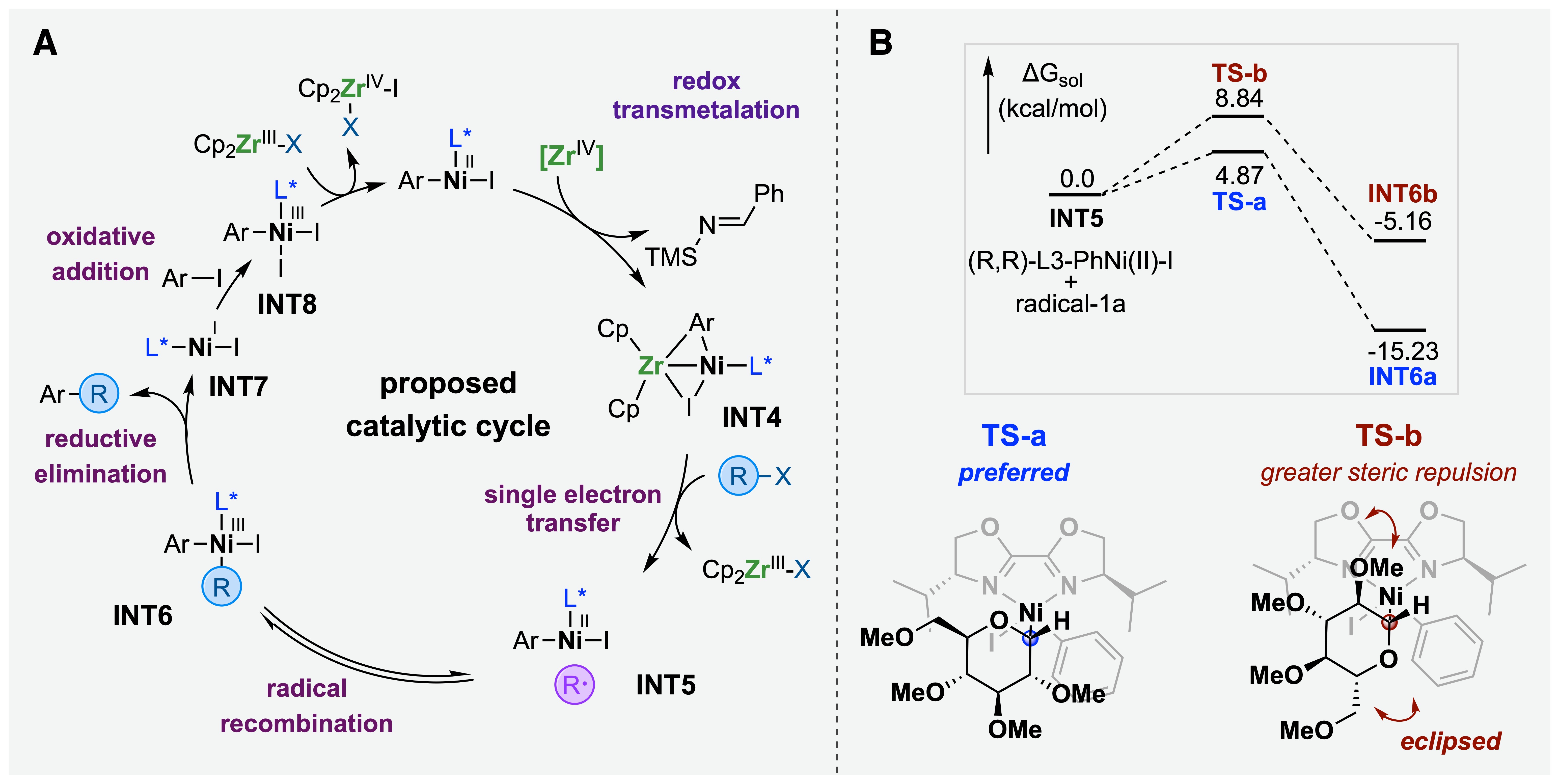 机理实验和理论计算的研究结果显示(见图三,A),锆氮杂环丙烷的作用并不仅仅是替代经典体系中的还原剂,而是在其独特的氧化还原转金属化机制中,形成了一种瞬态的开壳双金属镍-锆物种INT4,且其价态可能会瞬态互变。在催化过程中,该双金属物种作为强效且高效的单电子还原剂,能够促进糖亲电受体生成糖自由基,并进一步与二价芳基镍反应(INT5),形成高能量的三价镍中间体INT6。实验动力学分析阐明了连续还原催化机制,进一步还原消除生成的一价镍碘物种INT7与芳基碘进行氧化加成,形成了新的三价镍INT8。该物质最终被原位生成的低价态锆试剂以单电子还原形式转化为二价芳基镍,实现了催化闭环。此外,科研人员共同合作开展理论计算阐明了空间选择性的来源(见图三,B)。在(R,R)-biOx手性配体的影响下,计算显示过渡态TS-a的空间结构相斥力更小、能垒更低,因此通过还原消除反应的催化基元步骤主导生成α-碳糖异构体。采用相同原理,(S,S)-biOx配体的引入则促进了β-碳糖异构体的形成。