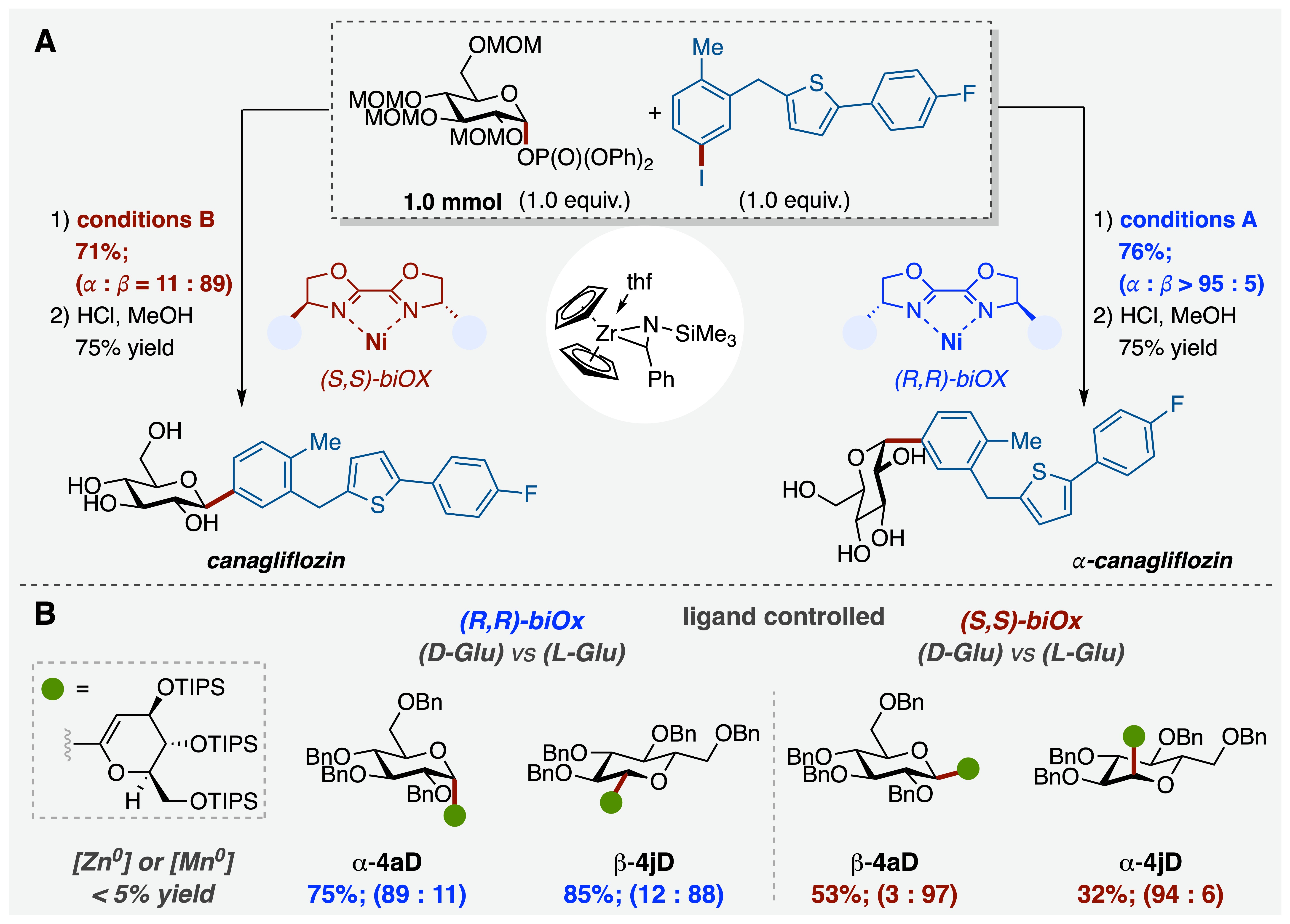 C-糖苷分子骨架广泛存在于天然产物、药物以及生物体系中,以格列净类口服降糖药为例,这类药物通过抑制肾脏中的葡萄糖转运体,减少肾脏对葡萄糖的重吸收,在降血糖和增强心血管功能方面具有显著的治疗效果。然而,实现精准控制该类C-糖苷键的化学立体构型是一项高难度的合成挑战。在已有的前沿催化研究中,糖骨架的手性环境通常诱导了该化学键的异构立体选择性。如果能够摆脱糖分子骨架固有的手性,通过手性配体诱导实现高选择性获得两种异构C-糖苷,将大大加速推动其在生命健康等领域的应用。