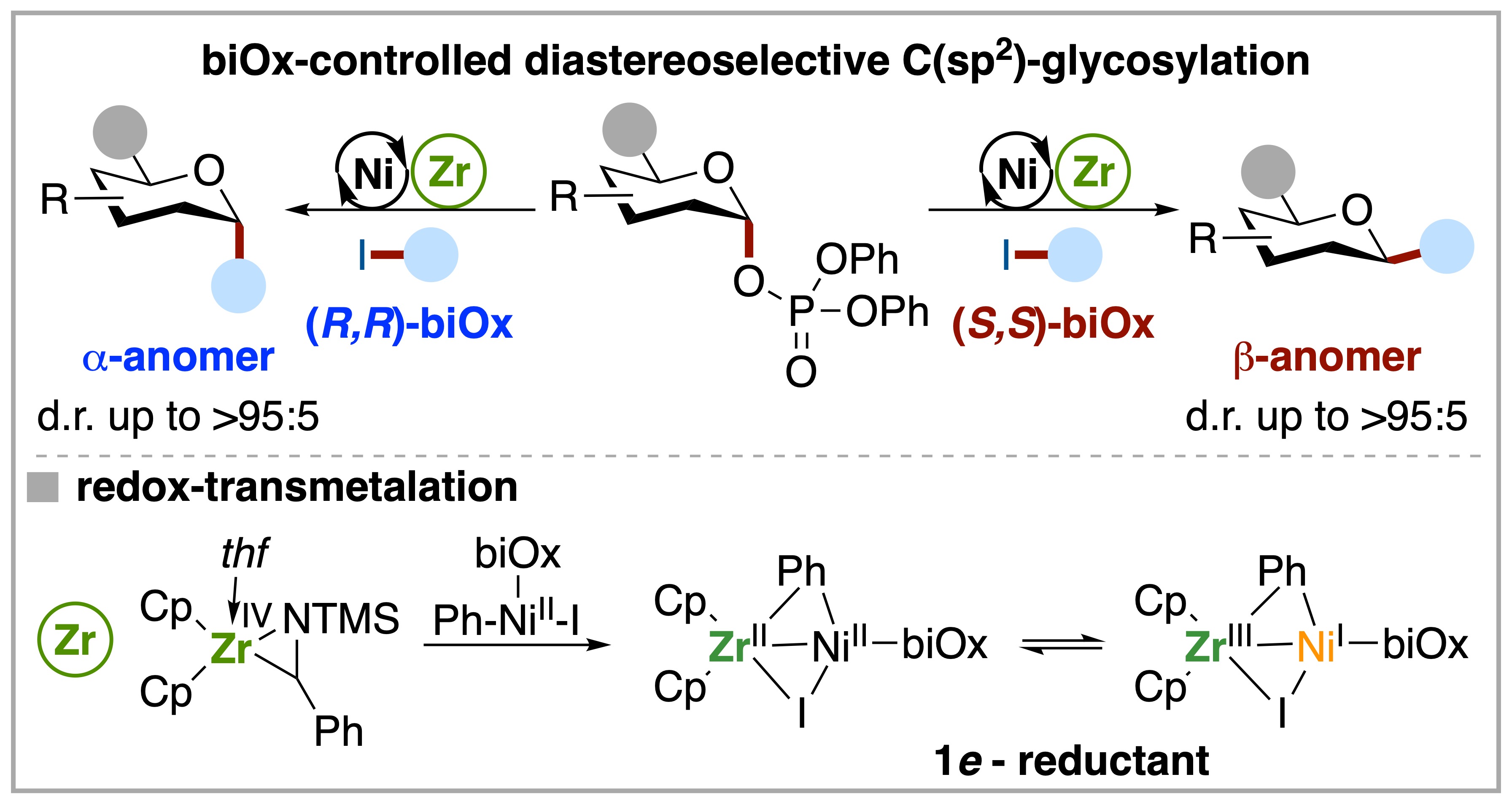 九游体育(www.jiuyou.com)官方网站物质科学与技术学院叶柏华课题组专注于研究新型过渡金属催化合成生物活性分子的研究,领先建立了锆氮杂环丙烷介导的氧化还原转金属新机制(redox-transmetalation)。在此工作基础上,叶柏华课题组发展了新型锆氮杂环丙烷介导的开壳镍催化,首次实现了配体手性诱导合成系列手性C-糖苷化合物,近期以全文形式刊登在《美国化学会志》(Journal of American Chemical Society, JACS) (图一)。