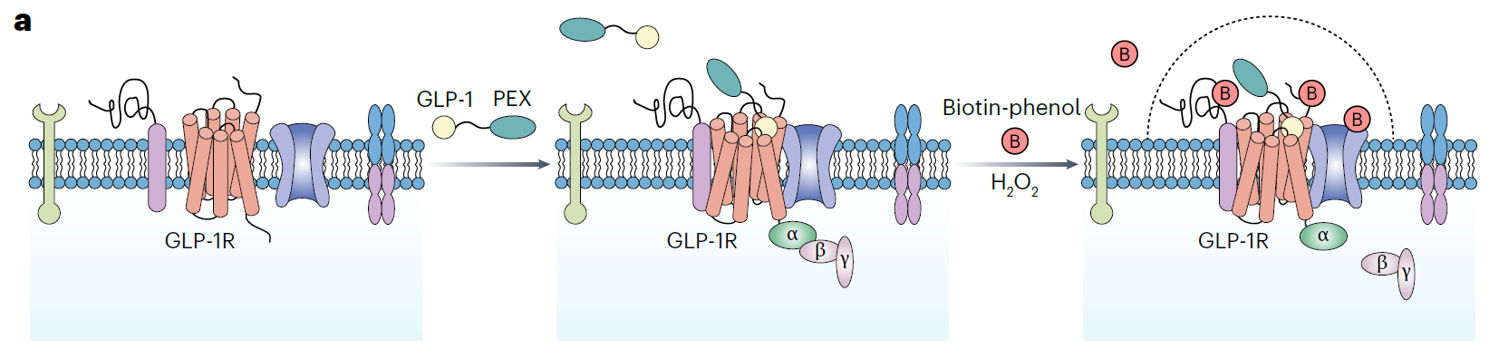 作为肥胖症与II型糖尿病药物治疗的关键靶点,胰高血糖素样肽-1受体(GLP-1R)在多个组织中广泛分布且具有细胞类型特异的生理功能。在胰腺中,GLP-1R主要调节胰岛素分泌和细胞增殖;在大脑中,它则具有抑制食欲、保护神经和抗炎等功能。鉴于受体的成熟、定位、激活、内吞等过程都受到蛋白质相互作用的影响,研究受体与细胞表面其他膜蛋白的相互作用对于深入理解GLP-1R的调控机制至关重要。但大部分膜受体表达量低、互作瞬时且微弱,因此针对内源性GLP-1R开展细胞膜蛋白的互作组研究,首先需要发展新的研究手段。