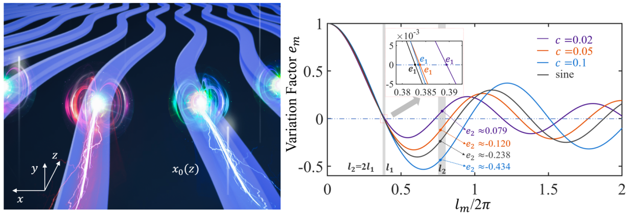 图1.(左图)轨迹调制密集波导阵列结构示意图;(右图)耦合抑制原理。